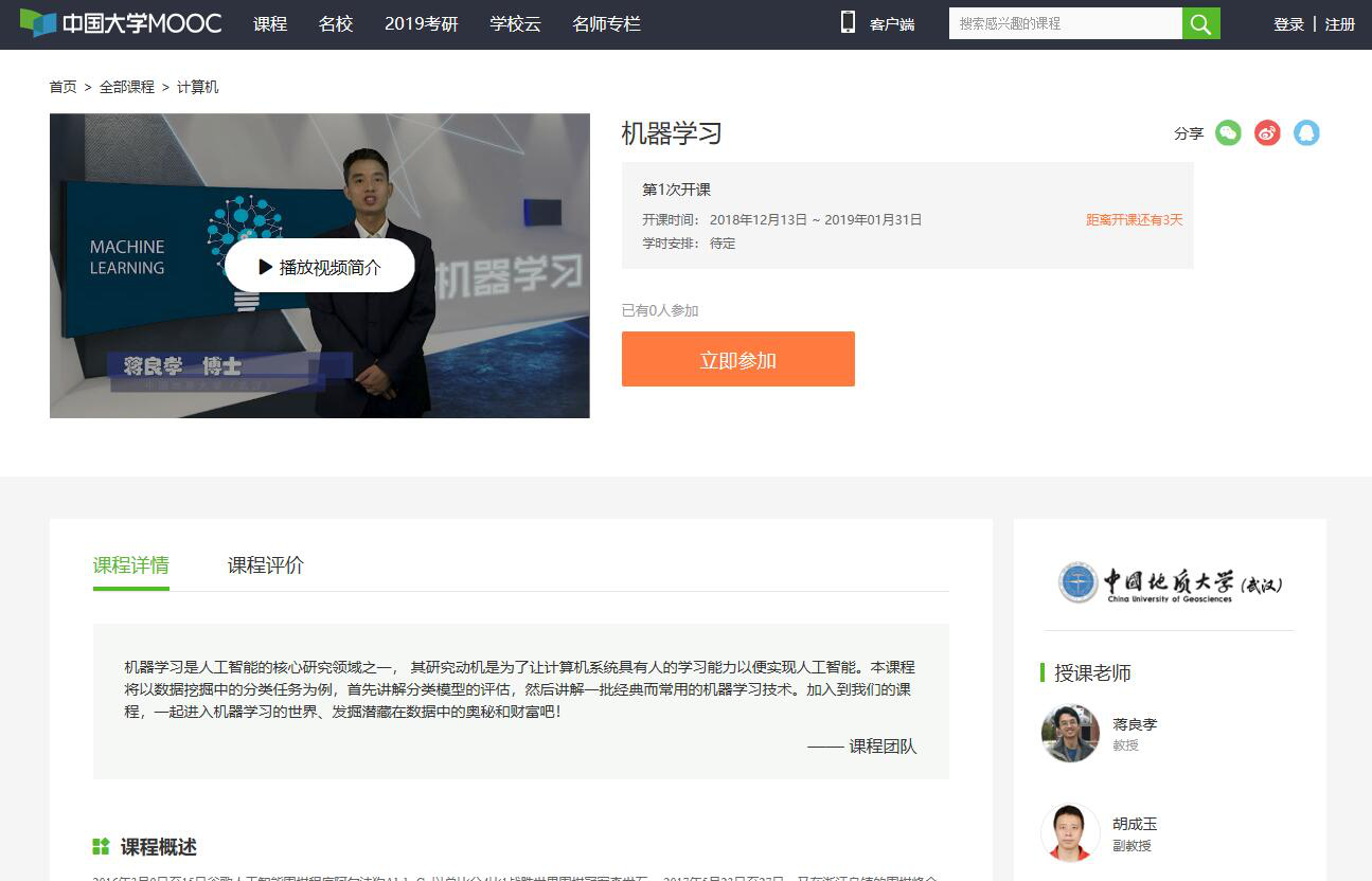 2018年12月13日,免费看a片 (武汉)《机器学习》课程在中国大学MOOC平台正式开课。本课程由免费看a片 教授蒋良孝,免费看a片 副教授胡成玉主讲,课程内容精心设计,为学生提供了便利的学习平台。本课程将以数据挖掘中的分类任务为例,首先讲解分类模型的评估,进而讲解一批经典而常用的机器学习技术,是高等学校机器学习领域科研人员和对机器学习兴趣浓厚的师生不可或缺的高质量课程。课程链接: