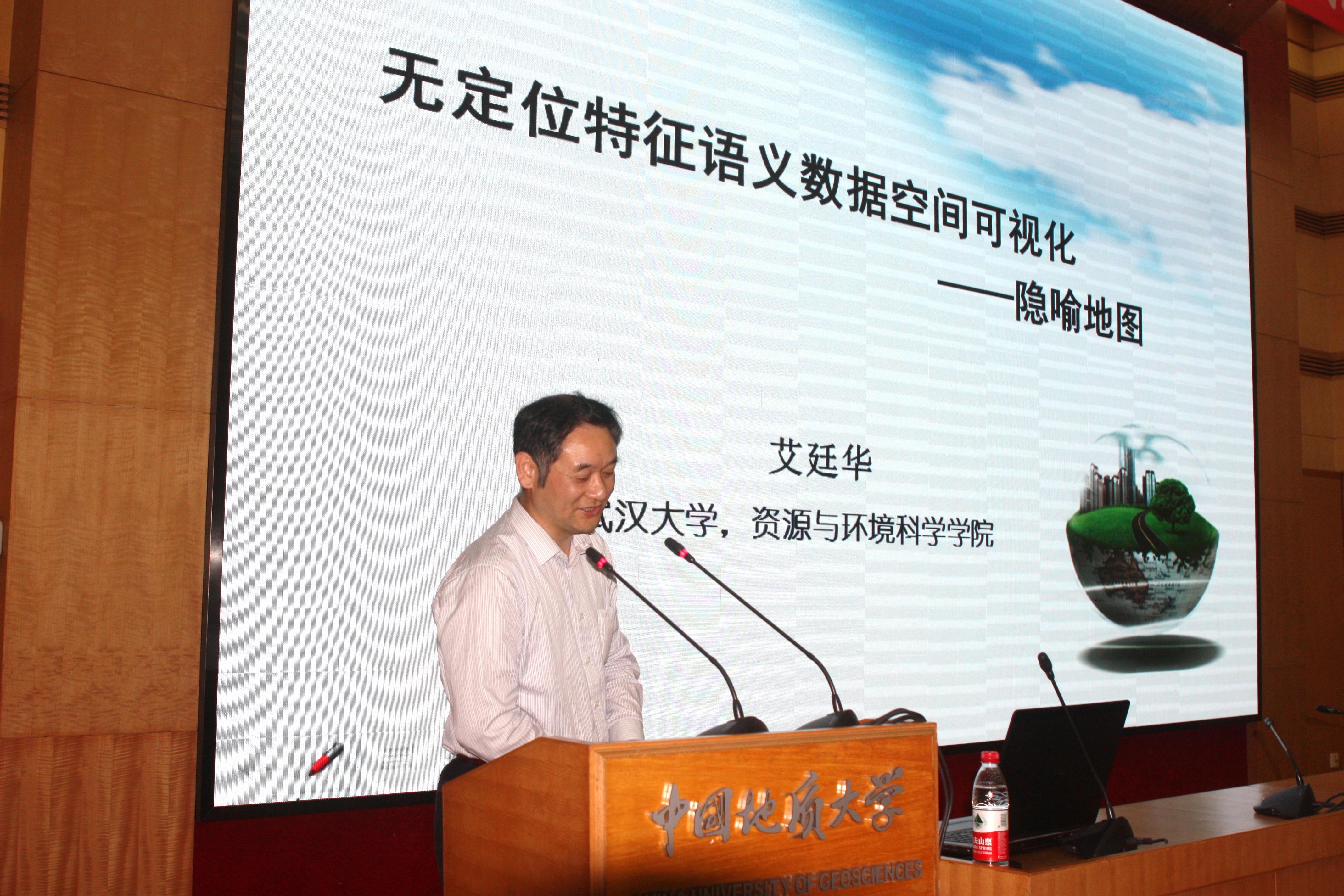艾廷华教授以非定位特征语义大数据的空间可视化为动机,借用自然语言中的隐喻修辞手法,向大家介绍了一种新的数据可视化方式——隐喻地图。他认为隐喻地图以其特殊的认知效应在可视化中功效显著,作为新的地图形式,拓宽了地图学可视空间的外延,并指出隐喻地图的制图规则仍有待深入研究。