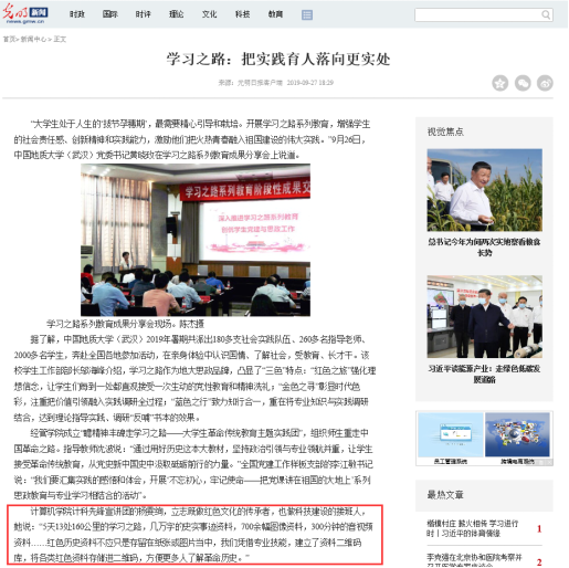 免费看a片 党委为推进新时代学生党建,落实“七个有力”实践探索,于2019年成立“计科先锋”,团队成员主要从本硕博各年级学生党员干部中选拔,综合素质较高。自2019年起,为深入贯彻习近平新时代中国特色社会主义思想,“计科先锋”团队连续三年进行暑期社会实践活动,其成果先后被光明日报、中国青年网、湖北高校思政网等媒体报道。