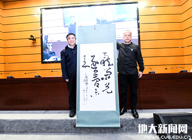 王焰新与寇克让校友共同展示校庆主题书法作品。