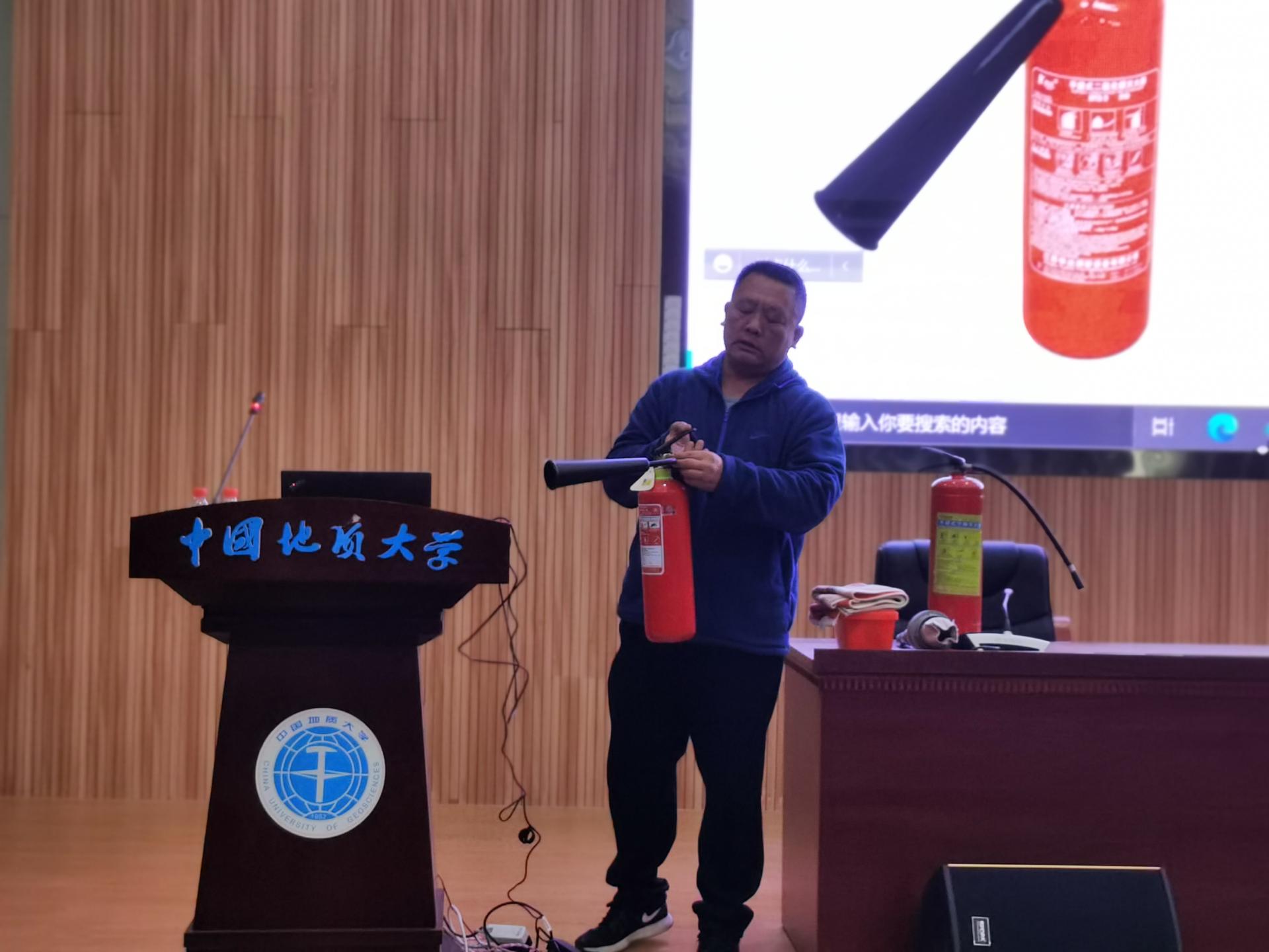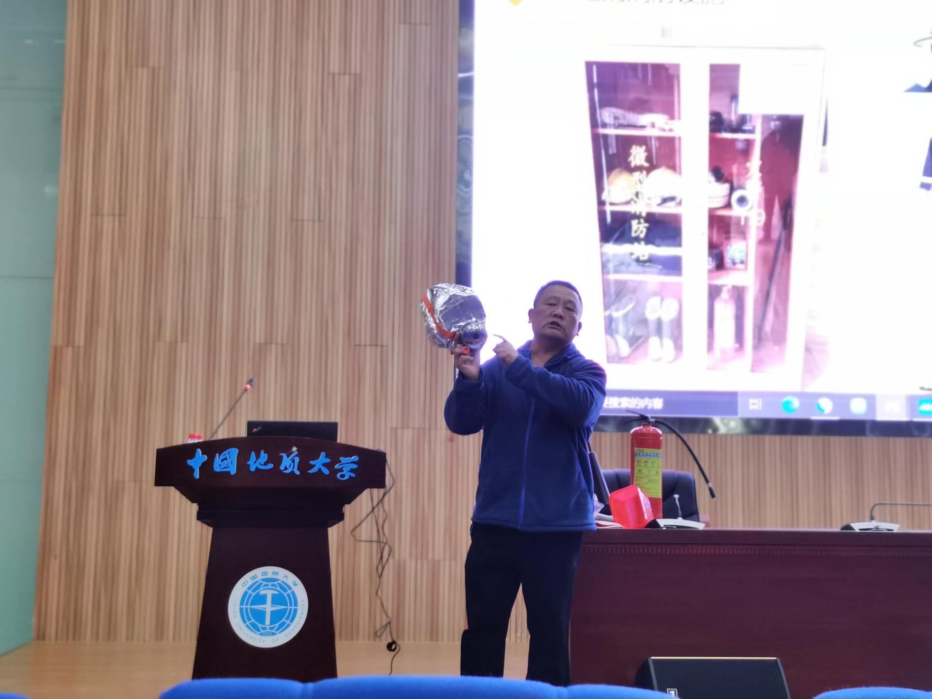 培训会上,周科长以《中华人民共和国消防法》为引入,明确了“维护消防安全是我们每个人的责任和义务”。接着,他以发生在我们周围的真实案例为切入点,以案说理、图文并茂,分别从学生宿舍、实验室、家庭厨房三大涉及安全隐患的空间进行阐述,提醒师生注意电器使用安全;深入浅出地讲解了火灾的形成、发展和危害,火灾预防常识以及火场疏散逃生时的注意事项;同时向师生展示了干粉灭火器、泡沫灭火器、防烟面具的使用方法。