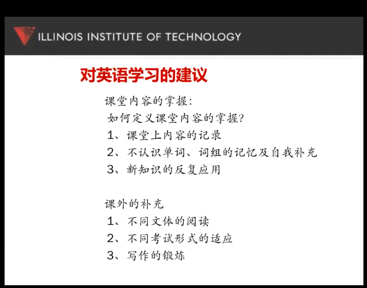 瞿华首先向学生了解课程掌握程度、课下学习方式、未来职业规划等,然后向学生介绍了IIT课程的评分机制与标准,最后介绍了本学期英语测试安排。瞿华用身边真实案例给学生讲解学习外教课程的心路历程,向学生传授英语学习方法,鼓励学生主动探索学习方式,并针对学生的提问进行一一解答。