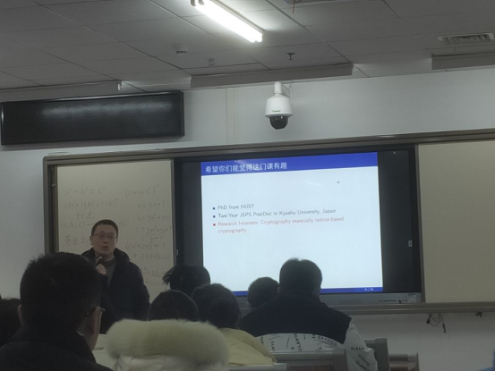 程池老师在开讲前贴心地为学生准备了纸和笔,引导学生养成良好的习惯,手脑并用。在讲授“信息安全数学基础”的勾股数部分时,他不断设定问题、抽丝剥茧,循循善诱,引导学生除了掌握基础知识,还要学会”怎样解决一个小问题”;通过讲授密码学特别是最近新一代抗量子密码学的进展,结合自己带领大三学生在行业顶会发表论文的经历,教育学生“志当存高远”,当“取法乎上,得乎其中”,切忌“随便搞搞就算了”。程老师始终面带微笑,但提问犀利,连续多个“为什么”,让课堂气氛略显“紧张”,不断将学生“逼”向思考的深处。