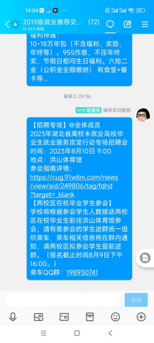 2023届本科毕业生辅导员闫维蓉在暑假期间仍心系未落实去向的学生,点对点关心未落实去向学生的动态。针对未就业学生,她积极了解学生目前的情况和就业中存在的困难,为学生提供招聘信息、推荐就业岗位;针对二战学生她关心同学复习进度,鼓励大家要树立信心,坚持到底。此外暑假期间她积极帮助同学们解决档案转接过程中遇到的各种问题。闫维蓉表示:“希望看到每一位19级同学都能找到满意的去处、有一个美好的未来”。