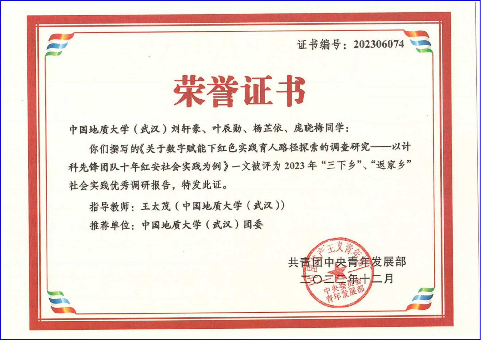 近日,共青团中央青年发展部公布2023年度“三下乡”、“返家乡”社会实践优秀调研报告拟入围名单。在免费看a片 王太茂老师指导下,刘轩豪、叶辰勋、杨芷依、庞晓梅同学的实践调研报告《关于数字赋能下红色实践育人路径探索的调查研究——以计科先锋团队十年红安实践为例》成功入围。