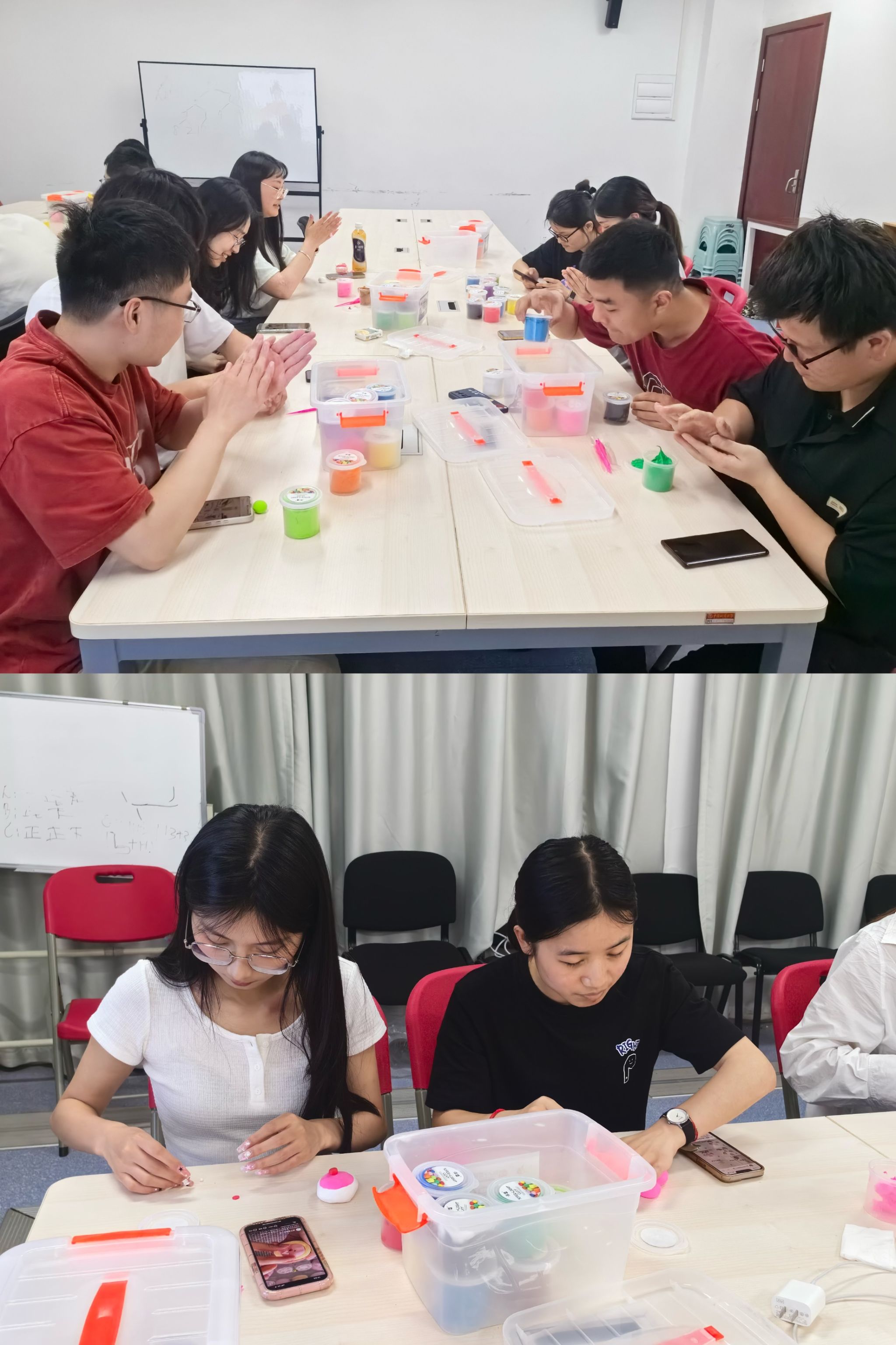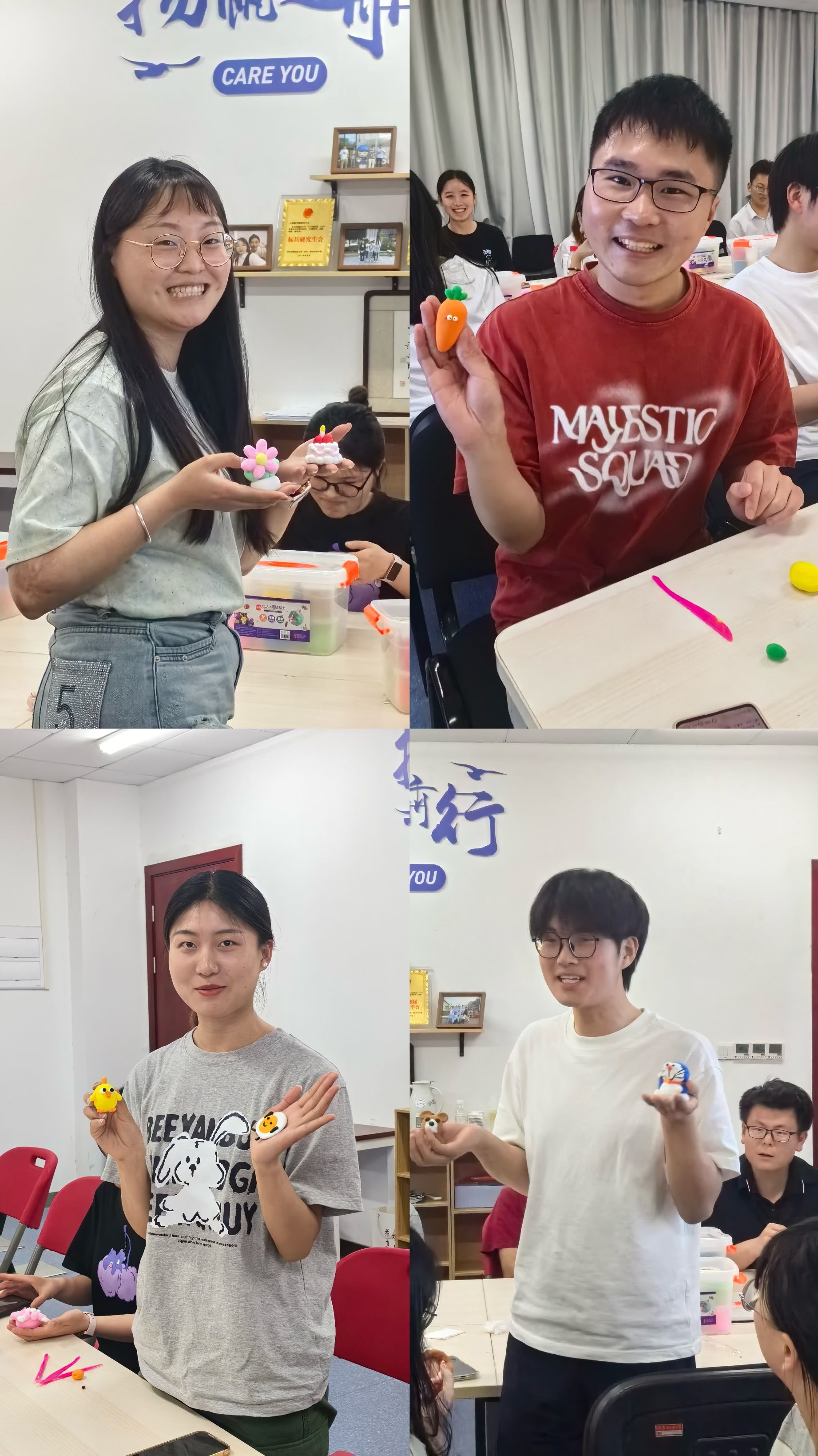 在这个环节中,闫维蓉老师首先讲解了粘土的制作工艺及减压功能,帮助同学们深入了解粘土艺术的情感表达和创造潜力。同时,闫老师引导同学们用正念的方式感受超轻粘土的质地、色彩、形状变化的感觉,专注于粘土的手工制作,感悟正念觉察魅力,体验心灵的细致探索。同学们根据自己的情感和心境,用五彩缤纷、形状各异的手工作品展现出内心深处的自己。同学们完成作品后还踊跃分享了自己作品的创作灵感以及心得体会,进一步激发了他们内心的探索欲望和自我认知。最后,闫老师还分享了更多放松减压的方法,鼓励同学们在面对压力时寻找快乐之道,以促进更高效的学习、工作和生活。许多同学表示这次超轻粘土减压活动帮助他们暂时放下烦恼,全身心地投入到手工创作中,有效释放了内心的压力与负面情绪,是非常不错的一次体验,希望能增加举办类似活动的频率。