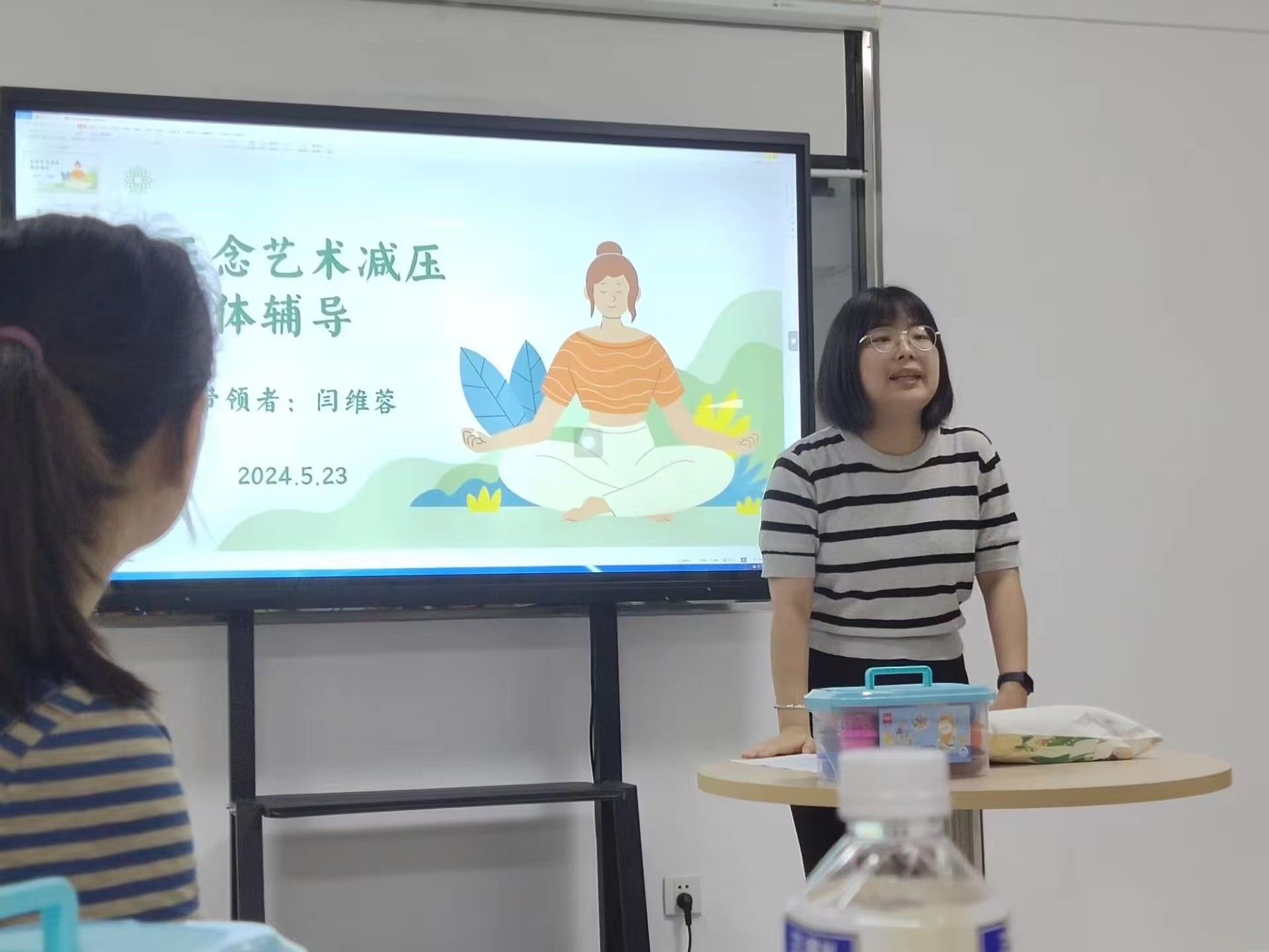 伴随着欢快氛围,活动进入正题。闫维蓉首先向同学们介绍了“正念”的起源及其科学性和有效性,随后带领同学们切身感受“正念”在疗愈身心方面的独特力量。
