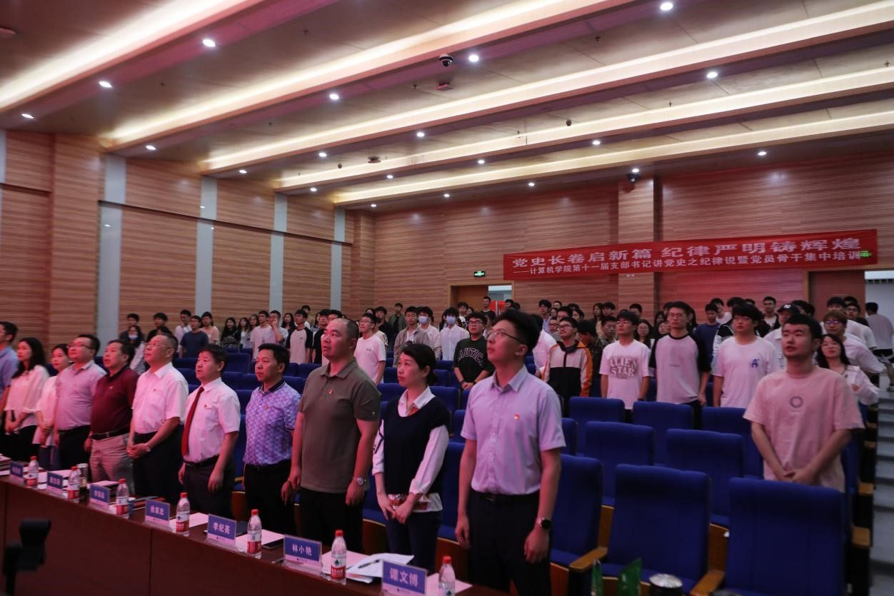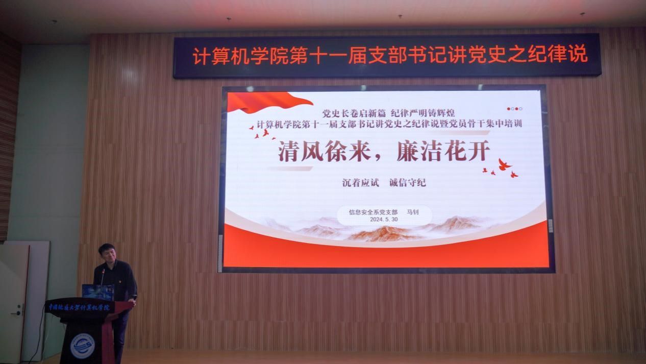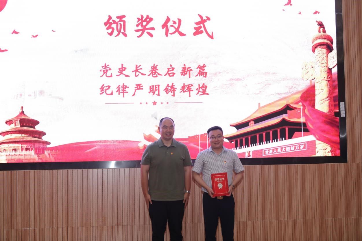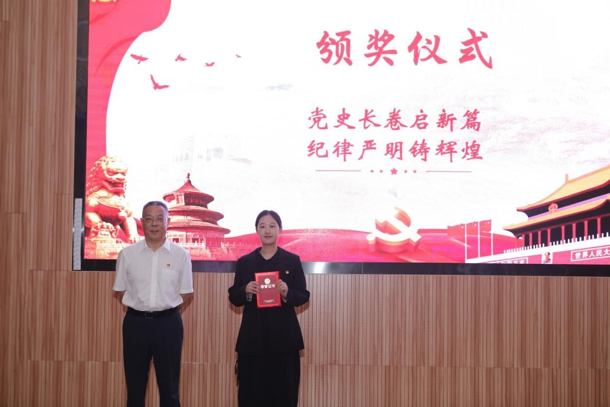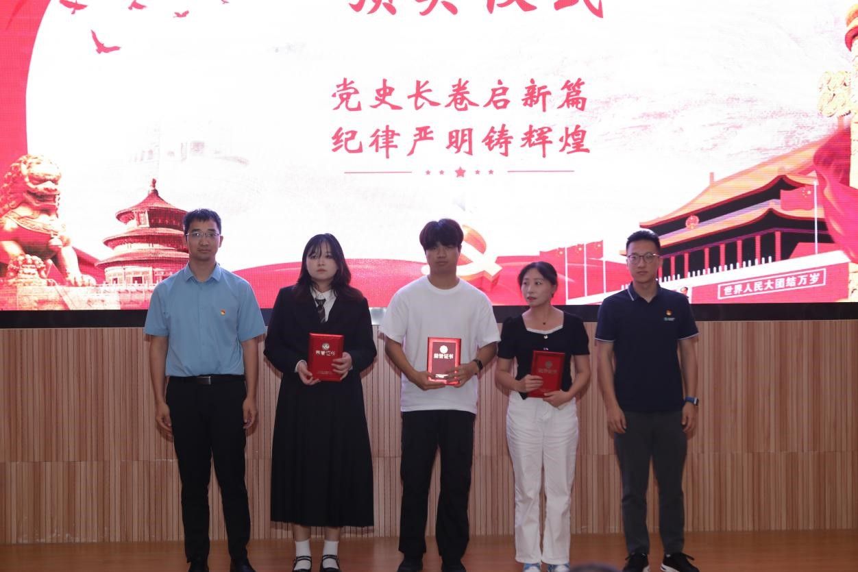 在示范党课环节,马钊老师以《清风徐来,廉洁花开》为题,深入浅出地阐述了廉洁自律的重要性,引导大家从现在做起,从身边小事做起,从遵守考试纪律、坚持推优评奖原则等日常学习工作生活做起,扣好廉洁自律“第一粒纽扣”。校友代表肖飞龙以《始终坚持严的基调 全面加强纪律建设》为题,带领大家深刻学习领悟习近平总书记关于党的自我革命的重要思想。李国昌书记原原本本领学了《中国共产党纪律处分条例》中关于政绩观的修订内容,分享了习近平总书记在延安梁家河、河北正定等地工作期间造福人民的故事,希望青年学生自觉学习党规党纪,切实践行造福人民的政绩观,并在新时代的新征程上不断建立新功。示范党课结束后举行了隆重的颁奖仪式。
