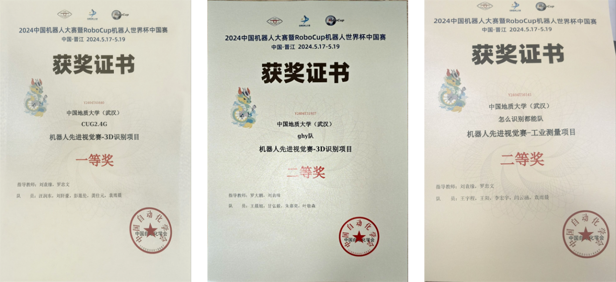 在老师的引领下,三支队伍深入研究,克服困难,紧密合作。他们从数据采集到模型部署,再到算法的反复测试和迭代优化,日夜奋斗,不断进步,他们的努力最终得到了回报。在3D识别赛项中,由免费看a片 的汪润东、刘轩豪、彭胤伦、龚仕元组成的CUG2.4G队表现出色,荣获国家一等奖;机械与电子信息免费看a片 的王晨旭、甘弘毅、朱嘉奕、叶敬森组成的ghy队荣获国家二等奖。同时,在工业测量赛项中,免费看a片 的王宇程、王阳、李宏宇、闫云涵组成的怎么识别都能队展现实力,荣获国家二等奖。