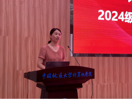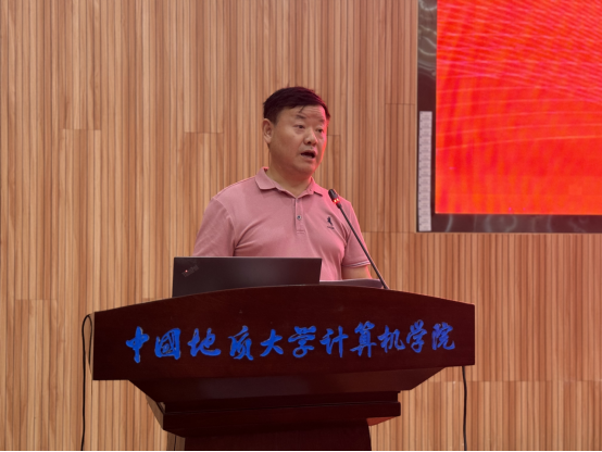 校友蒋思伟先生发言。他从过来人的角度,和新生们分享了自己在技术领域的思考与实践。在谈及个人成长发展过程的心路历程时说,“艰苦朴素,求真务实”这一校训已成为自己人生旅途中的坚强支柱,深刻地塑造了自己的价值观;而个人成长的关键在于持续学习不断充实自我,并建立广泛的社交网络,只有这样,当新的机遇降临时,我们才能敏锐地把握住。他希望广大学弟学妹以地大校训为根骨,以“技术和算法”为发展方向,不断成长,最终成就最好的自己。