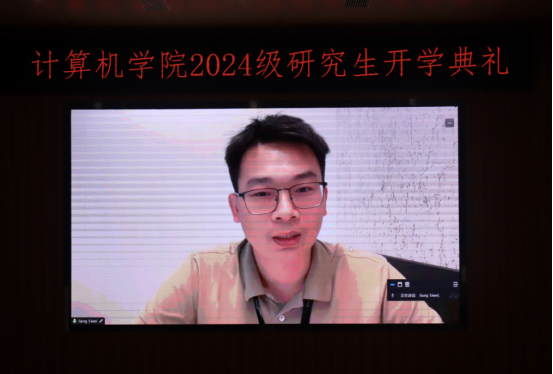 研究生导师代表陈麒玉教授发言。他代表全院教师向2024级研究生并表示热烈欢迎,并结合自身的科研成长经历,以“四心”箴言勉励新生同学积极进取、开拓创新:以诚心对待科研和学业,以热心积极进取,以匠心精益求精,以恒心坚持到底。他希望同学们既要仰望星空,又要脚踏实地,将科研目标与国家需求紧密结合,用所学知识解决实际问题;同时,也要做到编程之外,笔耕不辍,不断提升科技写作能力,将科研成果转化为高质量的研究论文。