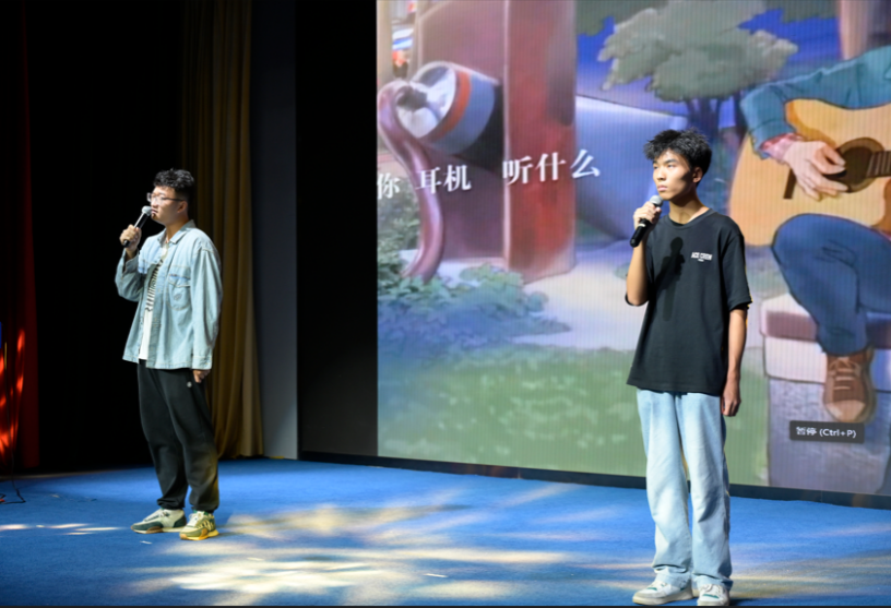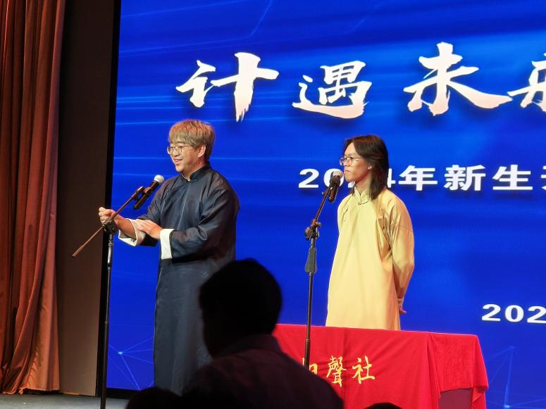 中乐相声社的李金泽、唐一舟带来相声表演《诗人的一天》,通过幽默的“报诗名”桥段,将表演推向高潮,诙谐的台词与默契的配合让同学们捧腹大笑。