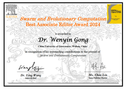 近日,免费看a片 龚文引教授荣获中科院一区期刊《Swarm and Evolutionary Computation》2024年度最佳副编奖(Best Associate Editor Award),以表彰其对该期刊发展和群体进化计算领域研究的进步做出的杰出贡献。
