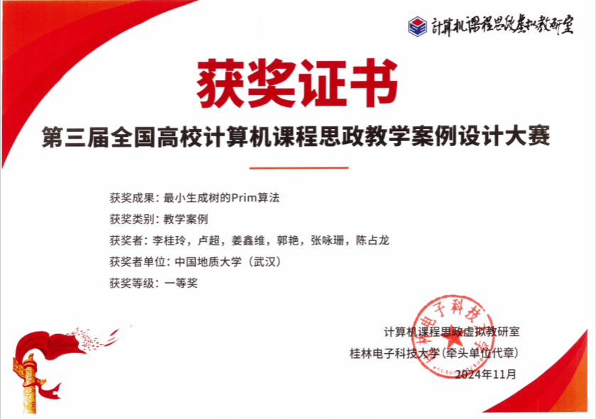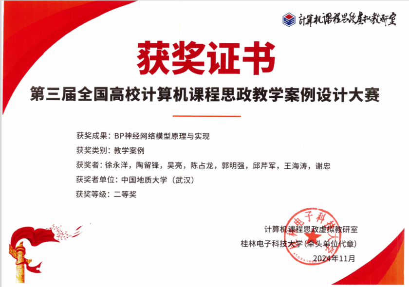在免费看a片 党委的大力支持下,多位教师携其精心设计的教学案例参赛。其中,邱芹军等老师提交的“地质知识图谱的构建及推理应用”、李桂玲等老师提交的“最小生成树的Prim算法”获得一等奖,徐永洋等老师提交的“BP神经网络模型原理与实现”获得二等奖。以上荣誉的获得不仅展示了免费看a片 计算机科学与技术领域的教学水平,更体现了免费看a片 在人工智能赋能思政教育融入课程教学方面的显著成效。