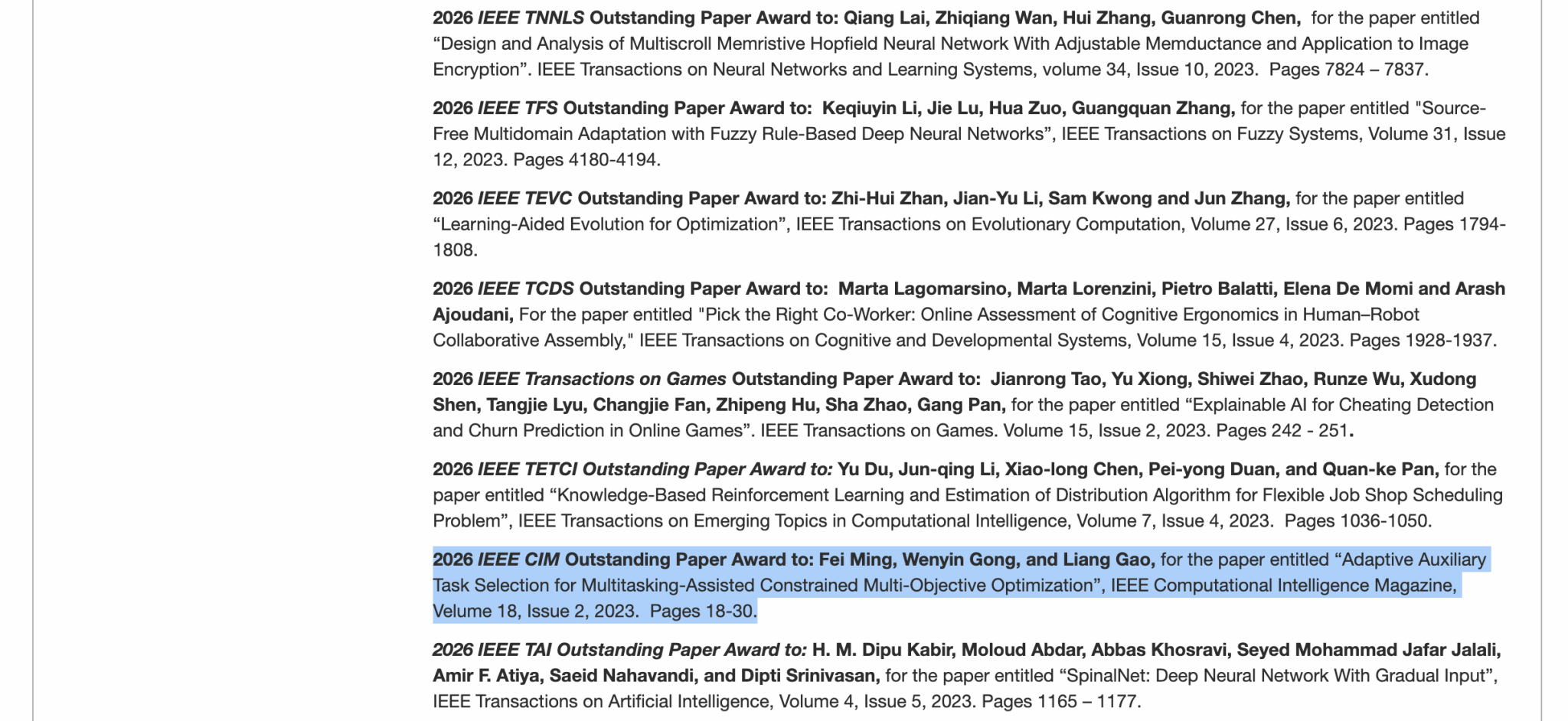 2021级博士研究生明飞作为第一作者、龚文引教授作为通讯作者的论文 “Adaptive Auxiliary Task Selection for Multitasking-Assisted Constrained Multi-Objective Optimization” 荣获 2026年 IEEE Computational Intelligence Magazine(CIM)Best Paper Award。