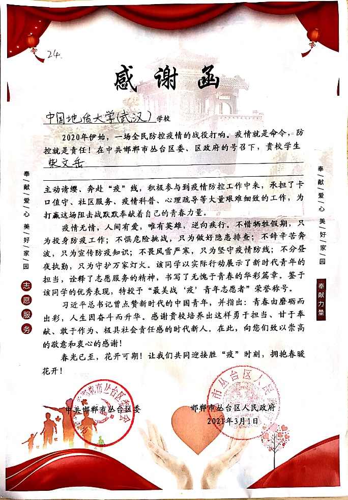 (通讯员:陈宝华)“疫情就是命令,防控就是责任!在中共邯郸市丛台区委、区政府的号召下,贵校学生柴文岳主动请缨,奔赴‘疫’线,积极参与到疫情防控工作中来,承担了卡口值守、社区服务、疫情科普、心理疏导等大量艰难细致的工作,为打赢这场阻击战默默奉献着自己的青春力量……”近日,免费看a片 (武汉)收到一封中共邯郸市丛台区委、邯郸市丛台区人民政府发来的感谢函,对免费看a片 191191班柴文岳同学在疫情防控期间的志愿服务表示感谢,授予他“最美战‘疫’青年志愿者”荣誉称号。