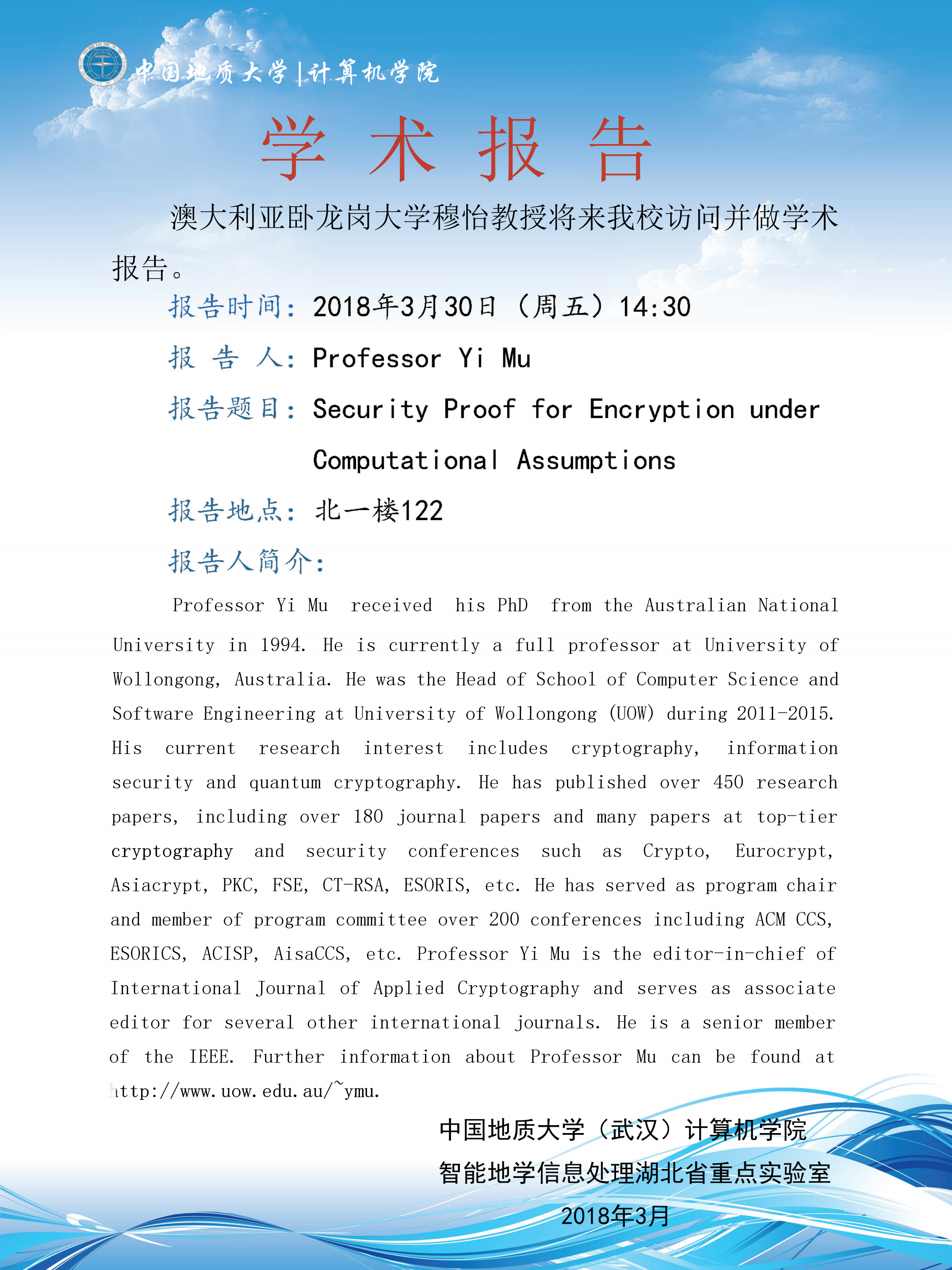学术报告——澳大利亚卧龙岗大学穆怡教授:基于计算假设的安全性证明