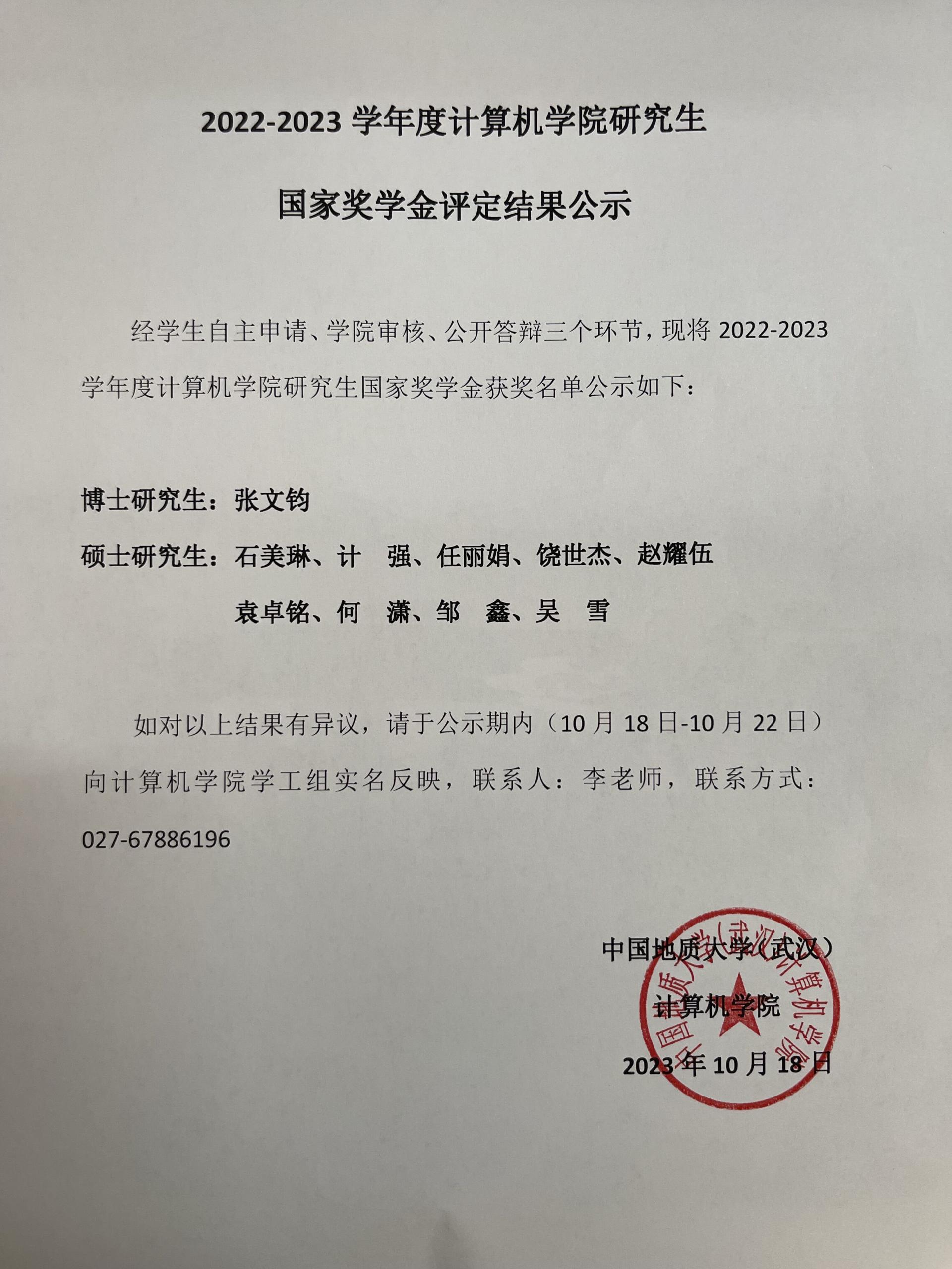 2022-2023学年度免费看a片 研究生国家奖学金结果公示