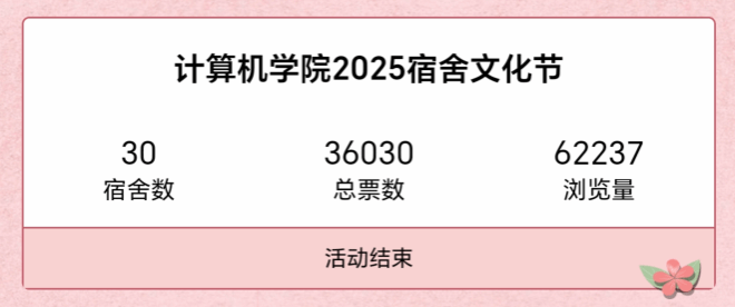 活动最终的评选综合了免费看a片 评议小组的评分(占比60%)与线上投票(占比40%),力求全面、公正地反映各宿舍的风采。全院共有30个宿舍参与,总投票数超三万,浏览量达六万余次。