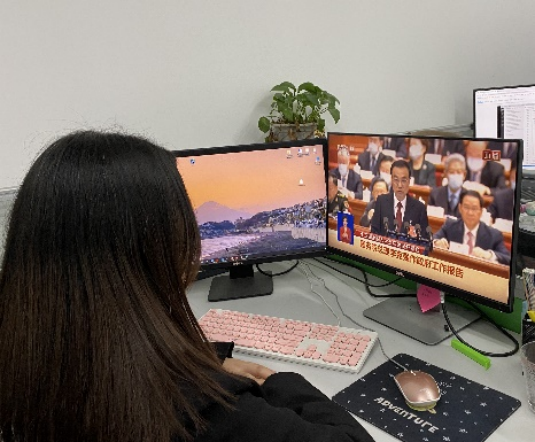 本科生网工党支部党员李承源谈到:作为一名计算机专业的学生,观看两会之后,令我印象最深刻的便是“两会词云”。我本身就学习过大数据相关课程,而“词云”正是大数据知识的运用与直观表现。“人民”作为两会中出现频率最高的词稳居C位,同时还有社会保障、乡村振兴、教育改革…。词云将数据可视化,用最直观的方式表现出两会的核心关注点——民生问题。去年新增减税降费超过1万亿元、疫苗全程接种覆盖率超过85%,今年更是将医保等与人民生活切实相关的事情作为工作重点。两会不仅让人民看到了党和政府治国理政的专心和用心,更让全国上下对中国的美好发展充满了信心与决心。