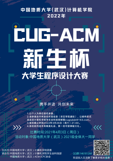 本次“CUG-ACM新生杯”程序设计大赛以个人为单位报名参赛,报名对象为免费看a片 (武汉)2021级所有学生。3月26日(周六)晚上21:00之前以Excel文件形式发至免费看a片 学生会科技部邮箱[email protected]。