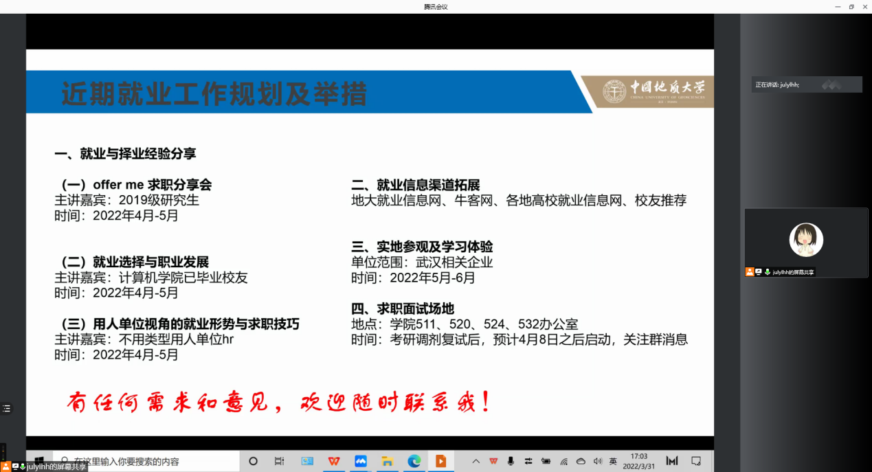 此外,李欢欢就求职就业形势与政策做剖析解读。整理分析免费看a片 现有的就业举措,如校友就业经验分享、网站就业信息拓展、实地参观活动预告,以及求职面试场地供给等。同时,针对存在就业疑虑的同学,提供多维度的咨询服务,包括一对一重点推荐、签约解约流程梳理等。