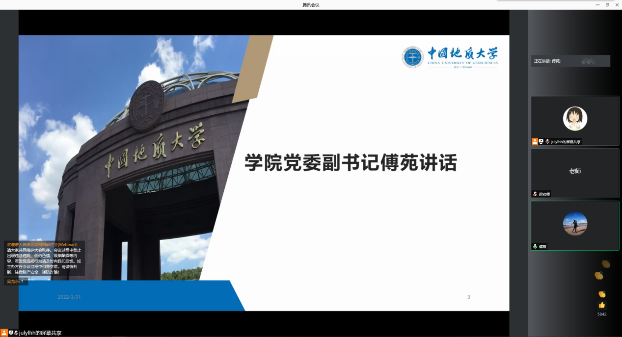 首先,傅苑从日常科研学习切入,叮嘱同学们抓住学习机遇,保持对科研的敏感度,秉持良好的学习习惯和科研态度,通过各类科研项目实践提升自身学术科研水平。当前,常态化疫情防控不能松懈,广大研究生要严格遵守各项管理规定,合理安排科研学习与个人职业发展,积极参与免费看a片 组织各类综合素质能力成长活动,主动拓宽信息来源。最后,她提醒同学们要谨防电信诈骗,健康生活,快乐生活。