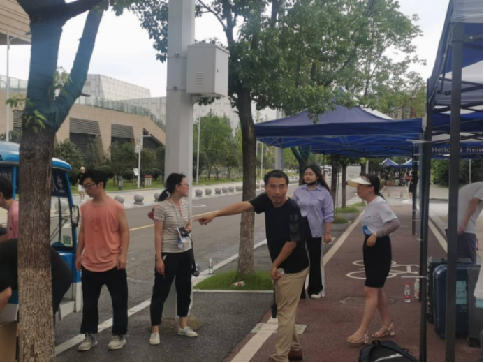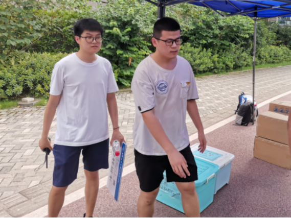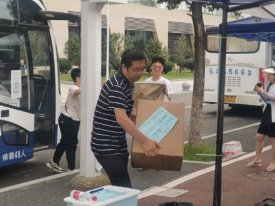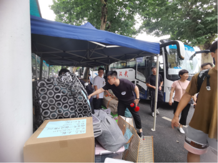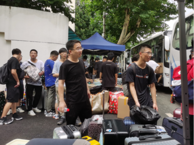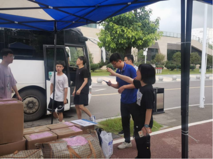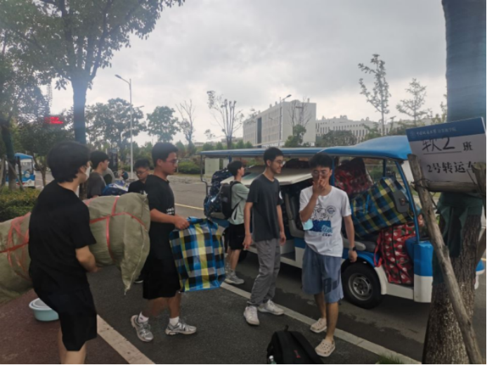 搬迁工作分上午和下午、南望山校区和未来城校区交替进行。早上7点,同学们已经开始陆陆续续将行李搬运至集合地点。