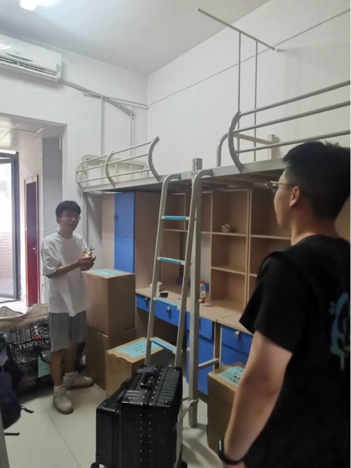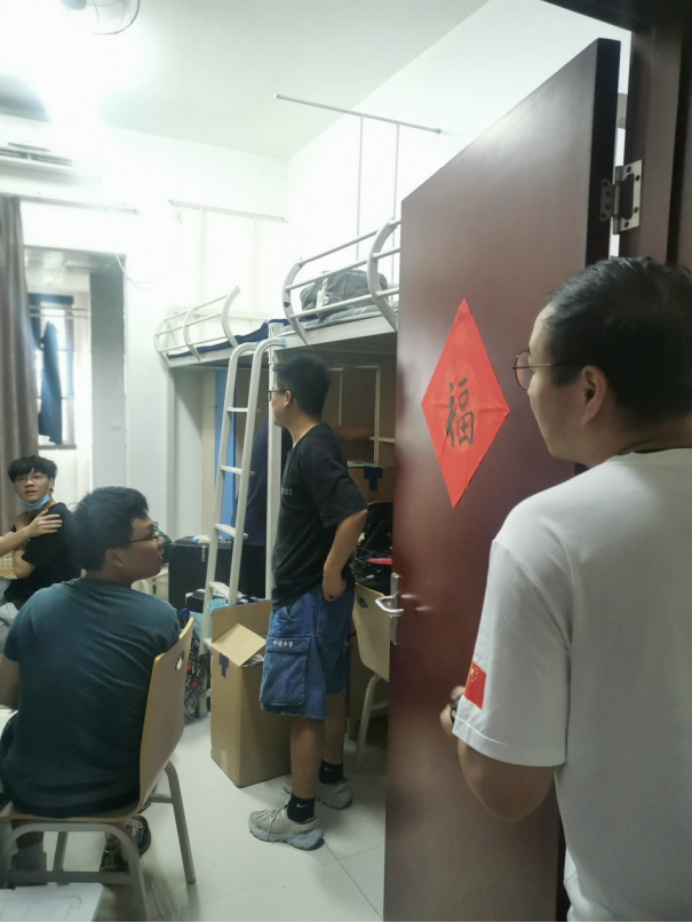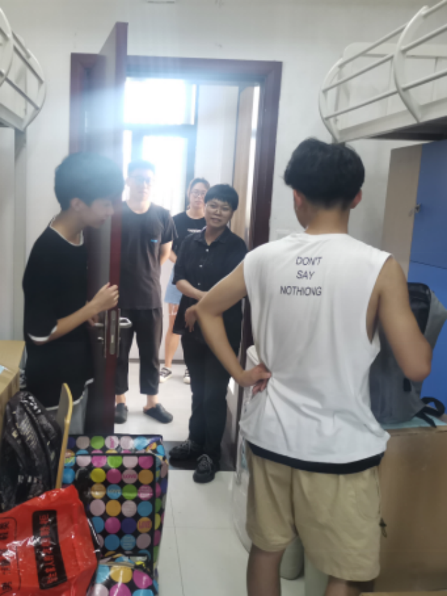 下午5点,最后一批行李搬运结束,同学们便开始了宿舍的整理和打扫工作。学工组老师们走访2021级学生宿舍,询问宿舍整理情况,为同学们答疑解惑。
