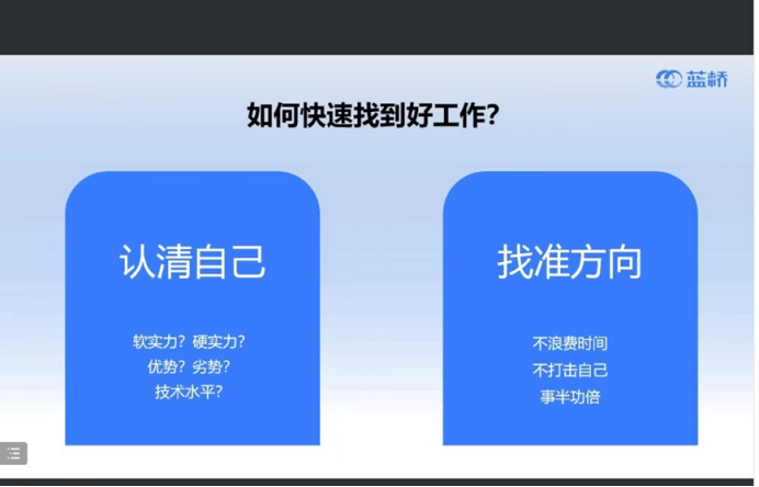 李亮提到,应届生拿到一个“高质量offer”的重点是抓住机会,其次是展示出来的综合素质、学习能力、自我约束能力、发展潜力。蓝桥通过大赛积累了大量企业岗位资源,推出了名企直通车的项目,助力学生精准定位、找准方向。蓝桥名企直通车旨在7-14天内了解学生求职能力和基本信息,通过培训提高求职实力,帮助同学们更精准、方便地拿到满意的offer。