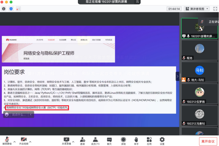 192211班刘佳豪同学表示:首先谢谢信息安全专业老师以及傅苑老师,谭文博老师向选择了信息安全专业的同学们的欢迎和祝贺。各位专业老师向同学们详细介绍了专业内容,课程安排,有关竞赛的准备事项。从学生的专业学习,到科研项目,再到专业竞赛,各方面都详尽考虑,向我们认真讲解,这让我感受到老师们对我们学生的殷切期望,希望我们可以有多种可能,可以在专业学习中找到一份坚持,以兴趣为依托,在信息安全的路上越走越远,路越走越开阔。今天晚上的会让我对未来的信息安全学习有了初步的了解和规划,受益匪浅,感谢各位老师和分享CTF相关经验的邰学长。