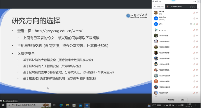 2023年1月9日晚,为了让同学们尽快熟悉信息安全专业情况,融入到信安大家庭,免费看a片 信息安全专业2021级师生新春见面会暨“1111”人才培养计划发布会通过腾讯会议在线上顺利举办。免费看a片 党委副书记傅苑、免费看a片 信息安全系全体教师、免费看a片 信息安全专业2021级全体同学和2021级辅导员谭文博参加本次会议,会议由信息安全系党支部书记马钊老师主持。