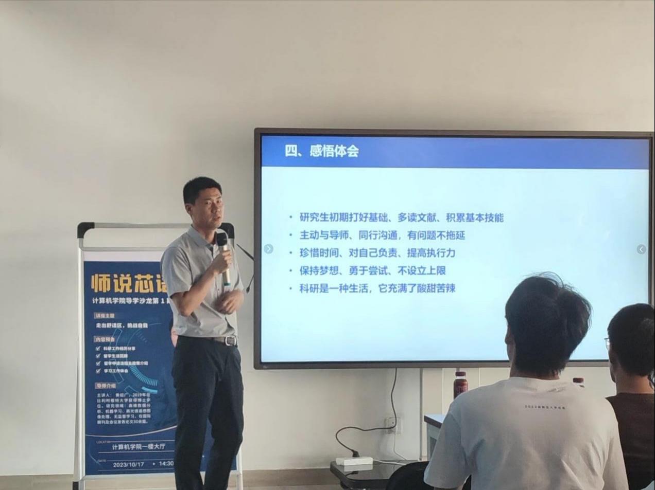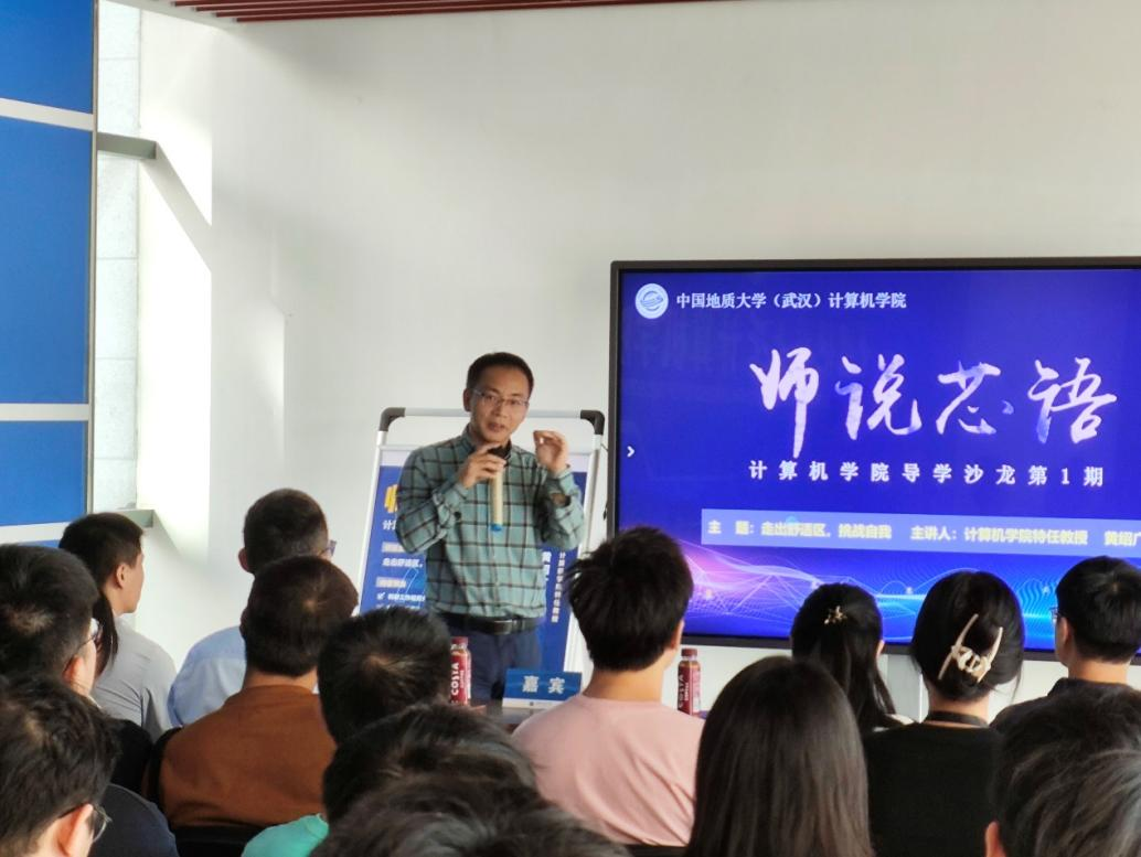 10月17日下午,免费看a片 导学沙龙“师说芯语”第1期在免费看a片 一楼大厅开讲。第一期开讲嘉宾为免费看a片 特任教授黄绍广,题目为“走出舒适区,挑战自我”。