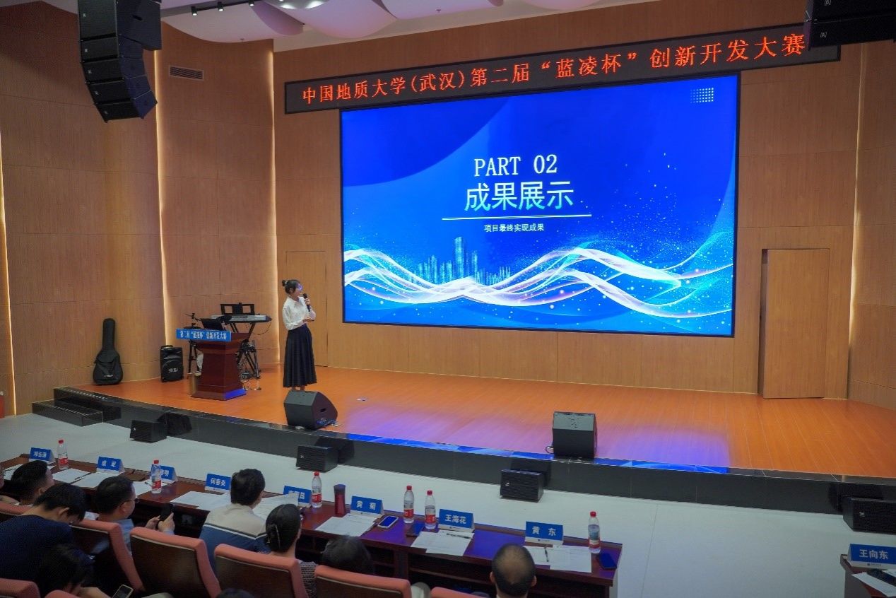 比赛正式开始,10支决赛队伍依次上台答辩。小队成员们精神饱满、细致生动地讲述了小队的开发进程与最终成果,充分展现了地大学子热情洋溢、精益求精的精神风貌。