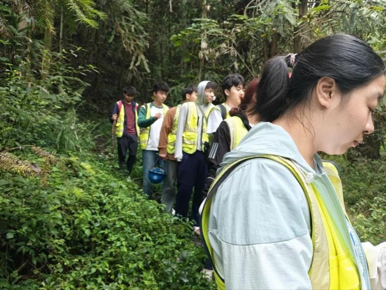 9月18日,雾河填图第二天,路线从雾河出发,到倒坡、白人坡,最后到窑坪子,全程要穿山林、爬陡坡,难度比第一天大了不少。出发前同学们重新调整分工:体力好的同学走在前面开路,观测的同学紧跟其后,避免错过沿途露头。刚进山林,路就变得狭窄湿滑,同学们便用地质锤拨开枝叶,眼睛紧紧盯着脚下,有同学脚下一滑,幸好抓住了旁边的灌木,才没摔下去,后面的同学赶紧伸手拉他:“慢点,踩我踩过的地方!”大家互相提醒、互相搀扶,好不容易爬到坡顶。沿途见陡山沱一二段岩性,莲沱组岩性,南沱组与莲沱组分界点,陡山沱组一段与南沱组分界点。这一天,同学们在山林里爬陡坡、遇风雨,却也在互助与坚持中,离雾河的地质真相更近了一步。
