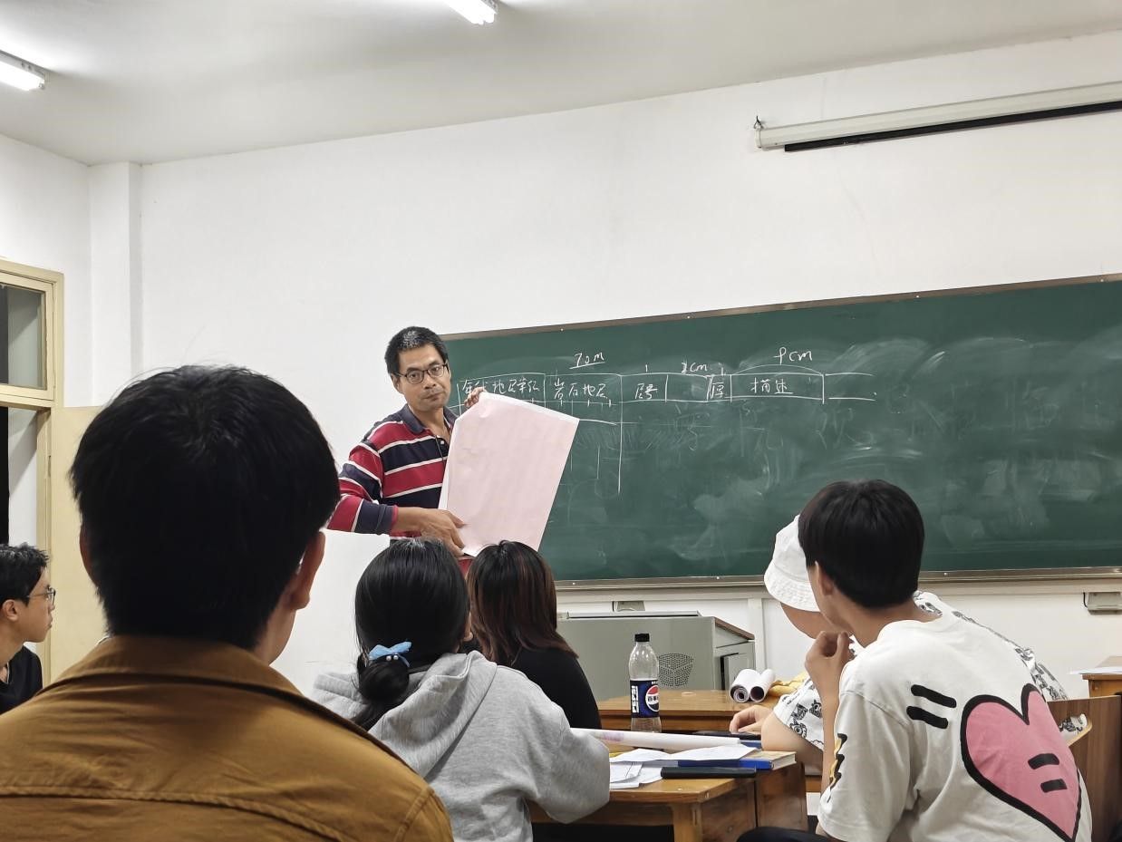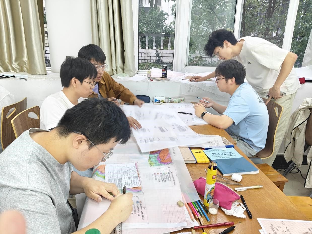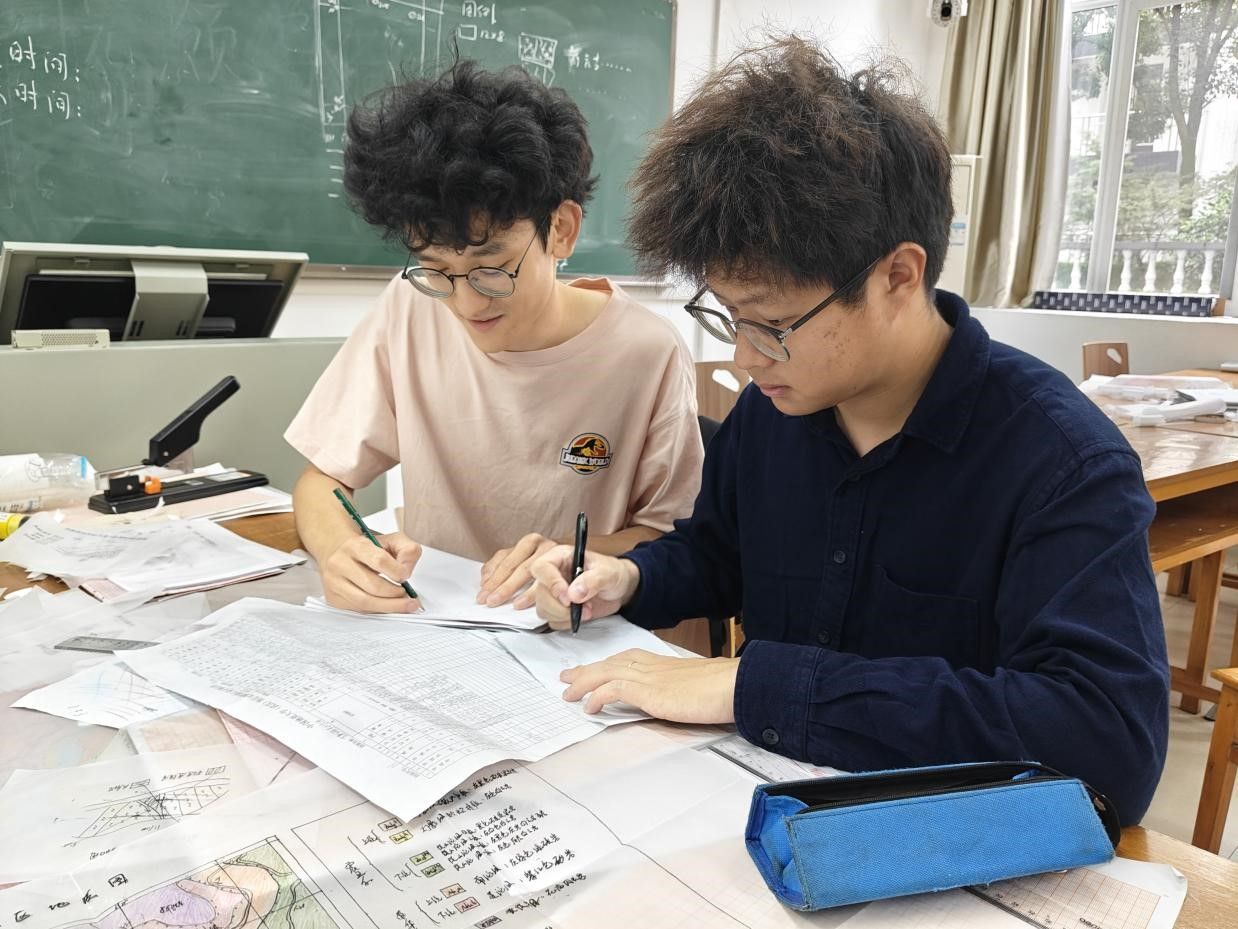 9月20日,前三天的野外攻坚结束后,各小组投入成果整理与绘图工作,将三天的山野收获转化为规整图件。在综合楼四教室,同学们日夜奋战,整理野外记录,在张志庭老师的指导下开始填图,严格遵循“从老到新”的顺序绘制地质界线 —— 先用深棕色勾勒出最古老的地层轮廓,再换浅灰色、米黄色标注较新地层。原本空白的地形图上,渐渐浮现出层次分明的地质分层,每一笔都承载着三天跑山的汗水,将野外看到的地质景象,清晰地“搬”到了纸上。小组内分工协作,彼此递换工具、核对细节,只为让最终的地质图精准呈现填图区的地层脉络。