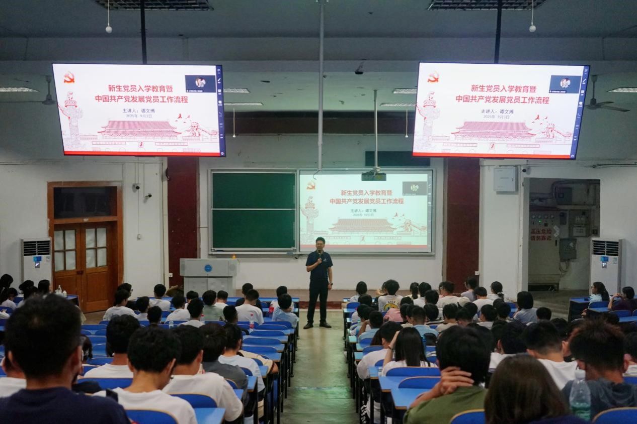 辅导员谭文博围绕“认识中国共产党、发展党员工作流程、免费看a片 党建办公室职能”三大核心展开入党教育。他介绍从“申请入党”到“党员转正”的五步发展流程,明确入党相关细节;同时介绍免费看a片 党建办公室架构,分享历届党建办成员成长案例,为新生明晰发展方向。