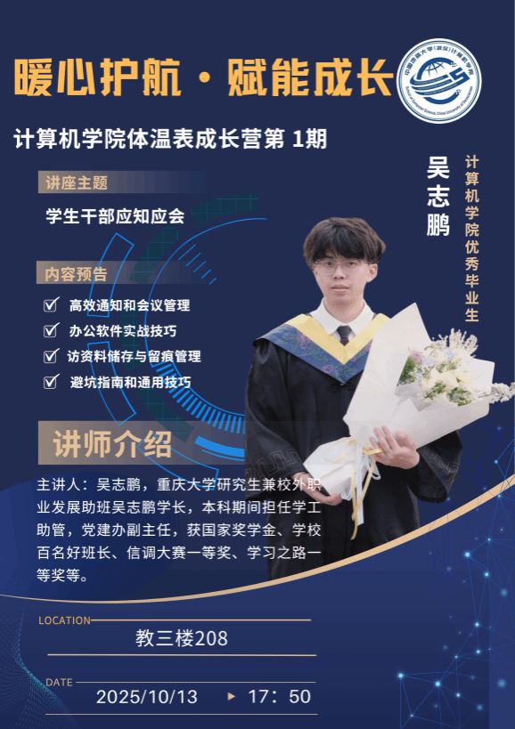 金秋十月,天高气爽。2025级计科学子满怀憧憬,正式开启了在大学校园的知识探索与成长之旅。为更好地陪伴和支撑新生们迈好大学第一步,免费看a片 筹划成立了2025级学生服务组并启动“体温表成长营”计划。一系列丰富多彩的学业支持与成长发展活动陆续展开,为本科新生的大学旅程提供了全方位的保障与支持。