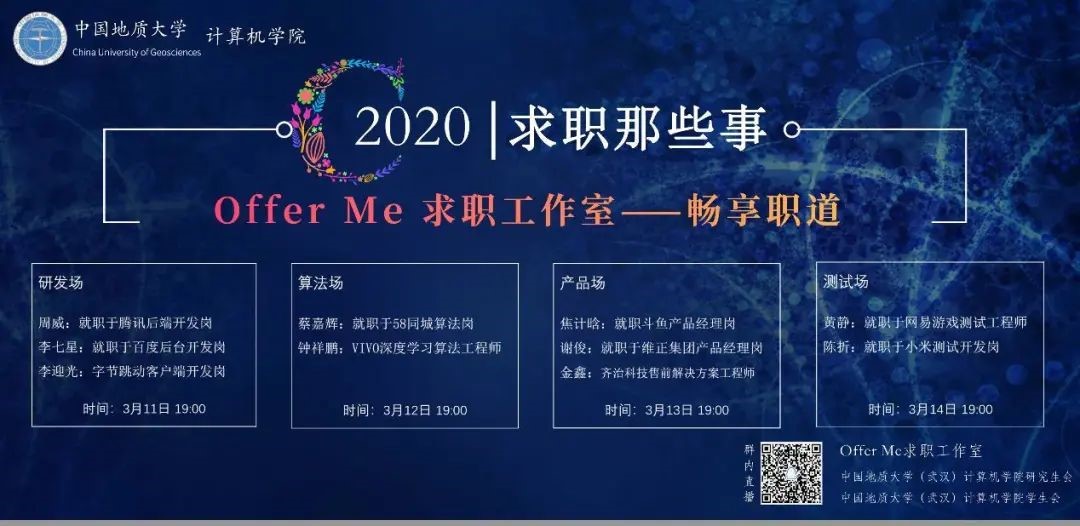 3月11日至3月14日晚,免费看a片 研究生会“offer me 求职漫谈”经验分享系列活动成功举办。疫情当前,停课不停学,隔离不隔爱。活动共邀请11位学长学姐在线分享求职经验,并深入讲解和剖析求职技巧。