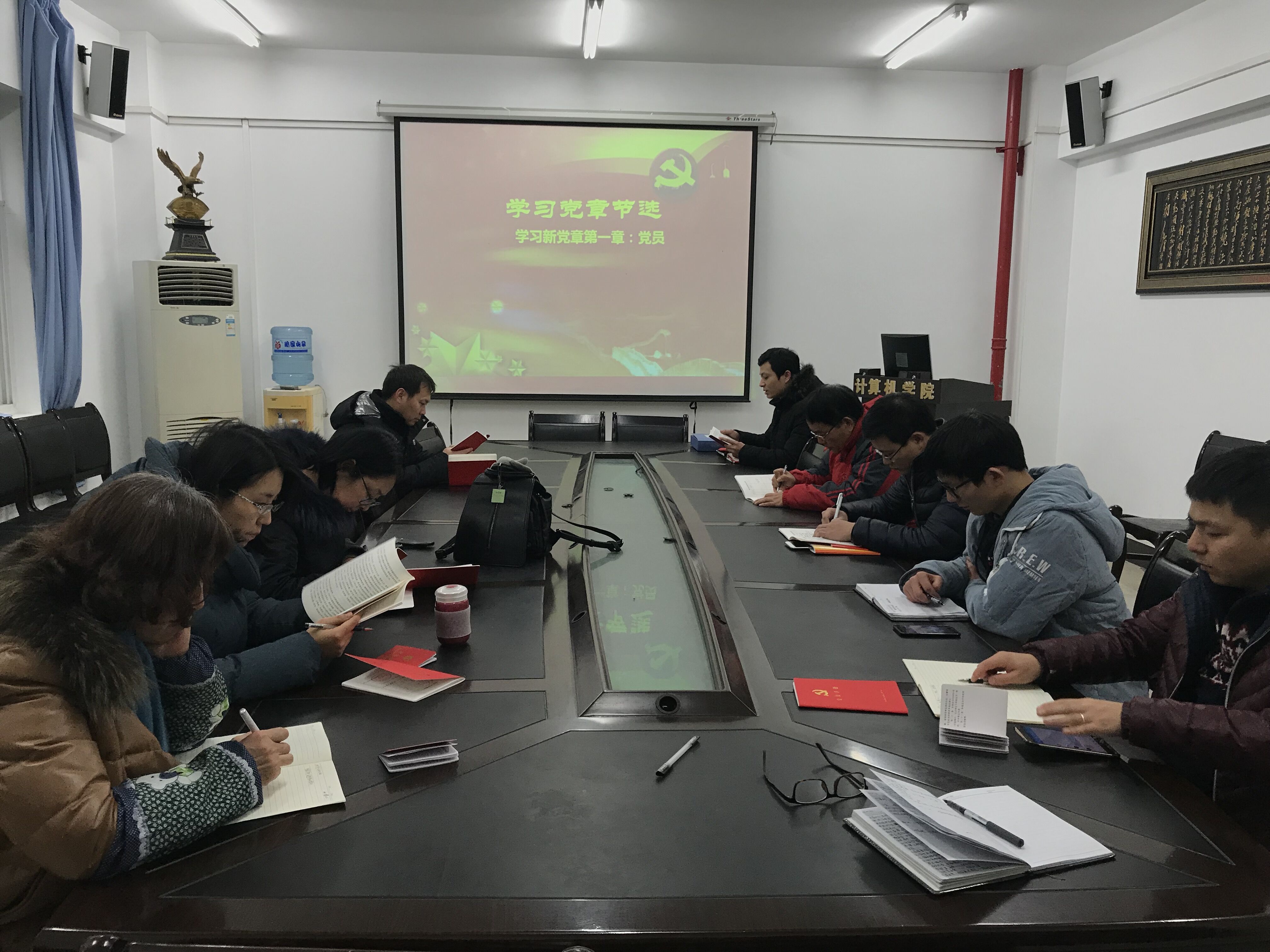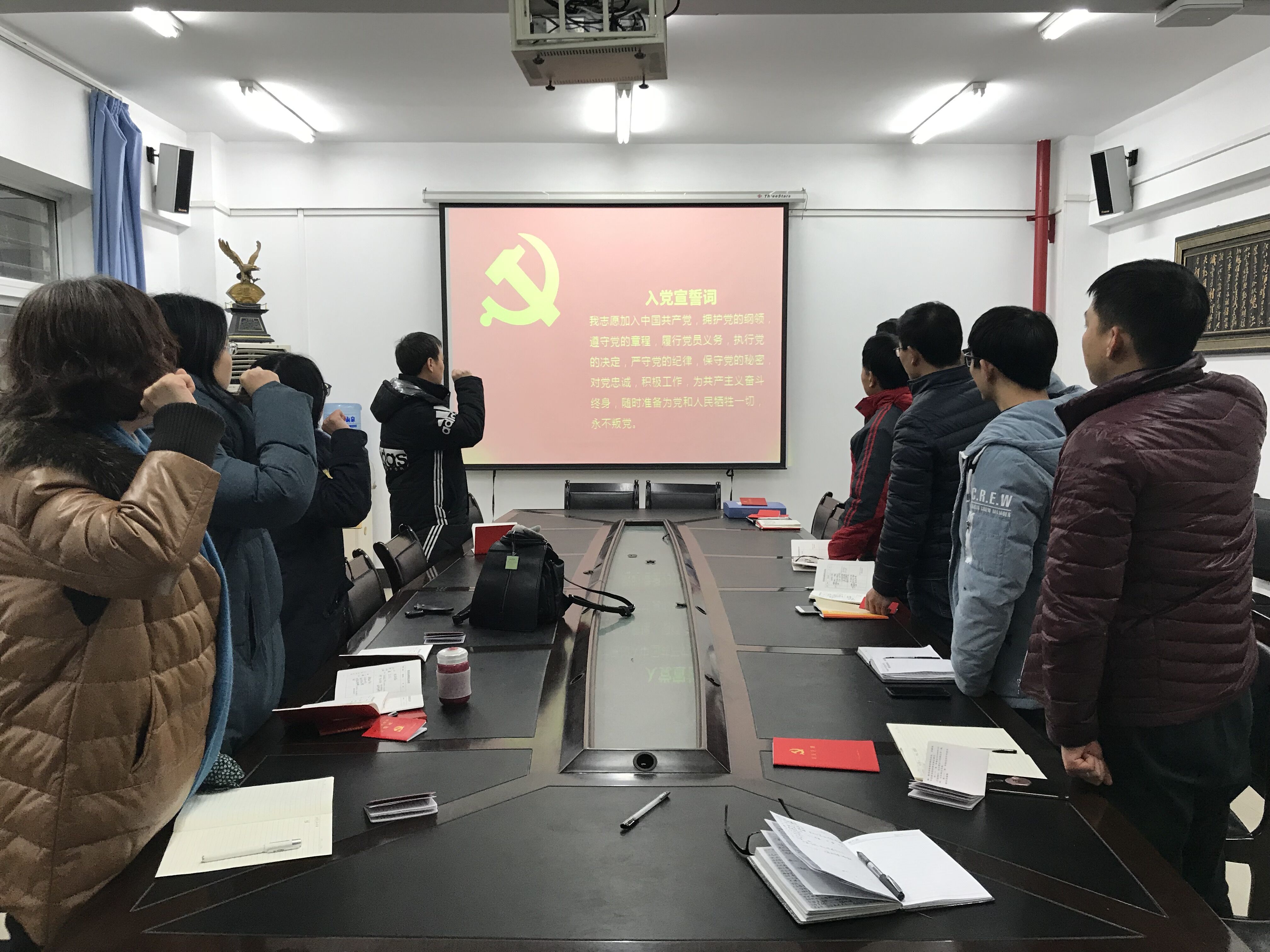在奏唱国歌、重温入党誓词、党章学习等规定动作之后,党员们一起观看了习近平2018年新春贺词的视频。视频中习总书记总结了我们的党和国家在2017年取得的成就和突破,提出了2018年的奋斗目标。希望大家增强使命感和责任感。