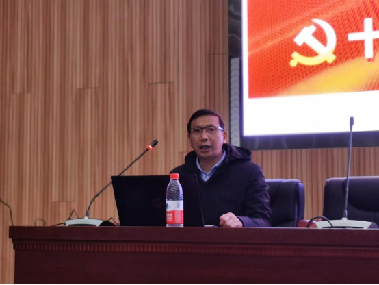 成金华首先强调了党的十九届六中全会召开的重大历史意义,并从会议基本情况、重大成果、主要精神和个人学习体会四个方面进行讲授。他以《中共中央关于党的百年奋斗重大成就和历史经验的决议》为重点,带领大家全面学习了党的百年奋斗的重大成就和历史经验,强调要把握三次“伟大飞跃”、十个“明确”、两个“确立”、十三个方面总结和一个“号召”,从党的百年奋斗中看清楚过去我们党为什么能够成功、弄明白未来我们党怎样才能继续成功,要牢记我们党是什么、要干什么这个根本问题,从而把握历史发展大势,更加坚定、更加自觉地践行初心使命,在新时代更好坚持和发展中国特色社会主义,不懈推进中华民族伟大复兴。