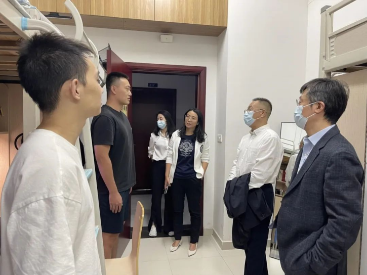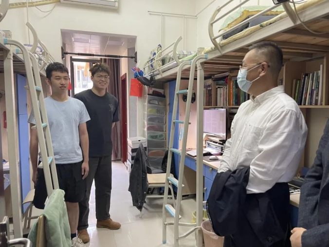 唐忠阳一行首先查看了老兵宿舍的住宿条件,对宿舍的内务卫生提出了表扬,表示大学生的内务卫生是老师们都关心的问题,希望同学们继续保持良好的作风,同时带动周围其他同学形成良好习惯。唐忠阳仔细询问了每一位同学的职业规划,并对大家继续深造和考公的规划进行了深入了解。最后勉励同学们要继续保持退伍军人的志气和本色,不管走到哪都不要忘记“根在地大”,踔厉奋发,为祖国发展贡献地大力量!