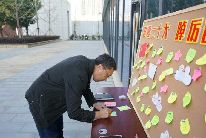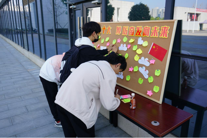16日上午,免费看a片 策划制作的“党风廉政建设”宣传展板,中国共产党历次党代会重点内容学习海报以及“喜迎二十大,踔厉奋发向未来”祝福寄语墙在免费看a片 一楼展出,引发广大师生的驻足学习、热议。其中,历次党代会学习海报以色彩鲜明的图文形式,生动描绘了从党的一大到十九大的历史背景和意义,启发师生们切身感受“学党史,强党风”的深刻内涵。在“喜迎二十大,踔厉奋发向未来”祝福寄语墙上,师生们留下了“凝心聚力新时代,团结聚力新征程”、“时间砥砺前行,岁月见证初心”、“青春向党,不负众望”的美好祝福和铮铮誓言。
