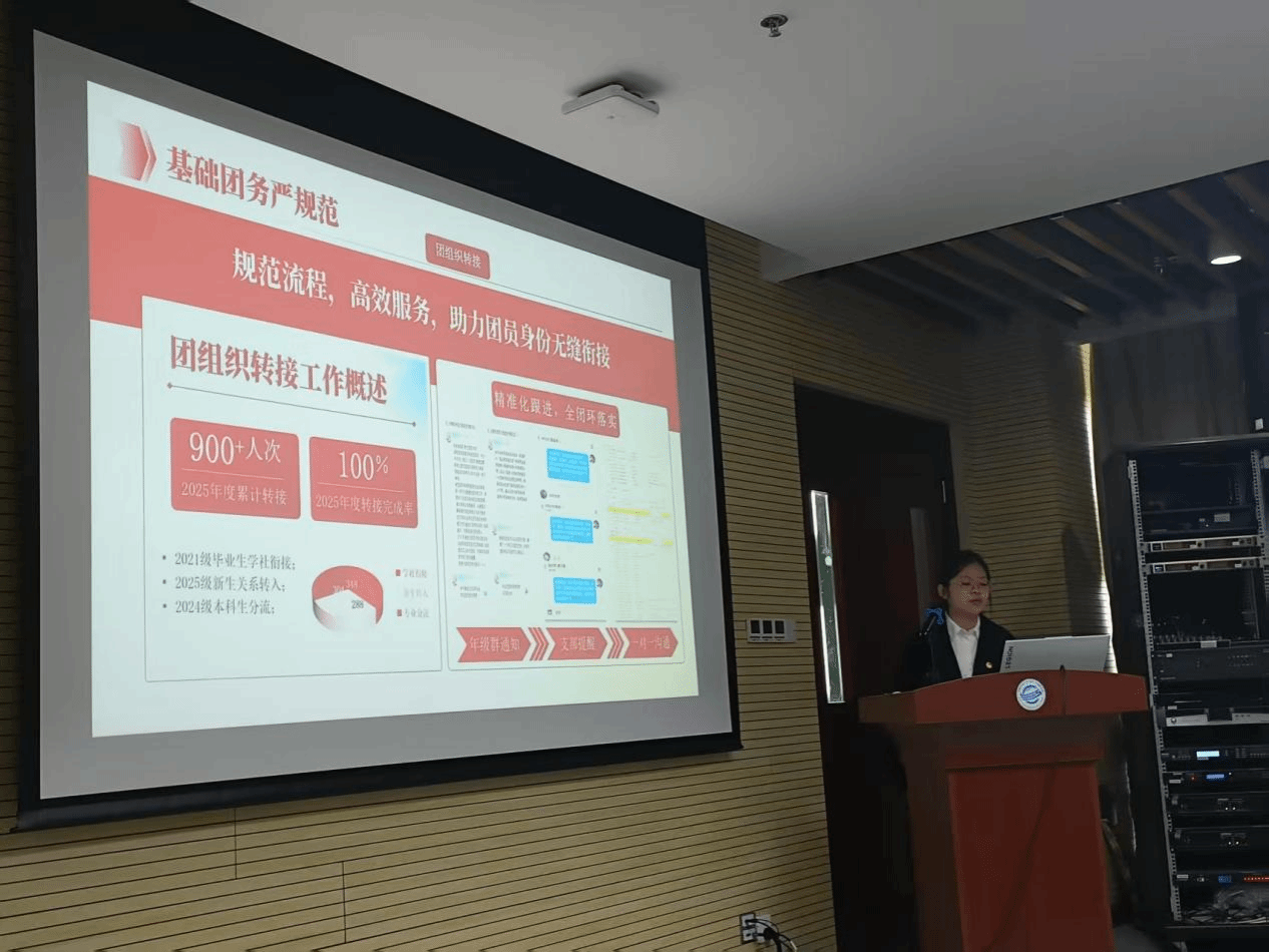团委学生会组织部以“在抓实基础中夯基擂台,在深化引领中铸魂育人”两句话总结工作。通过数据与图片展示团组织转接、团费收缴、团员发展、入党推优、评优评先等工作落实情况。对于未来的工作提出明确规划,并将持续以更为严谨的态度做好团务服务工作。