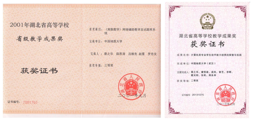自1986年任教以来,蔡之华老师长期主讲本科生课程和研究生课程,包括数据结构、离散数学、机器学习、计算机应用数学,承担过本科生学务指导老师和班主任工作。他任班主任的班级曾荣获“湖北省优秀班集体”。他非常重视课堂教学,常对学生说:“高效的课堂学习是培养学科兴趣的动力。”蔡老师“组合数学”(学生们习惯称呼,实为“计算机应用数学”)经常板书推导公式,给学生留下了深刻印象。他带领教学团队,积极探索新教学模式,延展课堂教学空域和时域,优化教学交互过程,提升教学质量。他带领的教研团队多次获得湖北省、学校教学成果奖,主持的教研项目获湖北省人民政府二、三等奖各1项,公开发表教研论文5篇,编写教材3部,其中一部获得免费看a片 普通高校优秀教材一等奖。他是国家一流本科专业“计算机科学与技术”建设点的负责人。