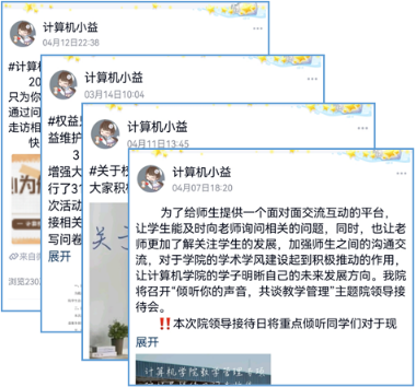 聆听同学诉求,沟通零距离。将免费看a片 权益服务平台“计算机计小益”,打造为全院学生诉求“收集站”,目前平台总关注人数达1384人,累计发送消息1307条,总浏览量达72831次。针对免费看a片 教育教学热点问题,开展院领导接待日,覆盖两校区,开展6次,研讨学风建设、教学建议。