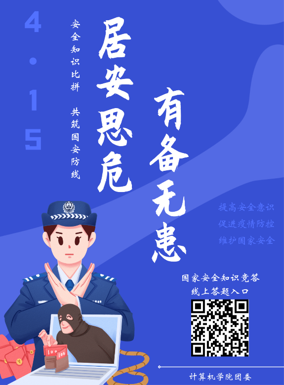 学术互融—双创工作催化剂。关注家国实事,赋能专业提升。依托专业特色,组织策划国家安全月系列活动,共包含七场活动,例如举办CTF网络安全竞赛,邀请全院青年共上一堂国家安全课,辐射总人数1000余人,以赛促学,以学促践,维护国家安全,共筑网安防线。