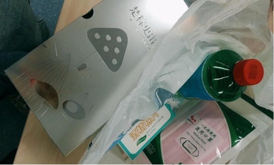 第二天,王老师特地从本部赶到新校区,给我带来了医用口罩、消毒棉和消毒水。而且,细心的王老师还给我带来了粽子,因为不久之后就是端午节。“棕”情“棕”意,暖在人心。