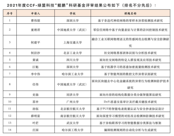 (通讯员:孙彦钦)近日,CCF-绿盟科技“鲲鹏”科研基金项目组根据课题申请方向,邀请了相关领域的专家,对课题的创新性、科学性、目标合理性等方面进行了综合性的评审,最终评选出14个项目获得“2021年度CCF-绿盟科技鲲鹏科研基金”资助,其中,免费看a片 任伟教授、董理君教授课题组喜获两项资助!