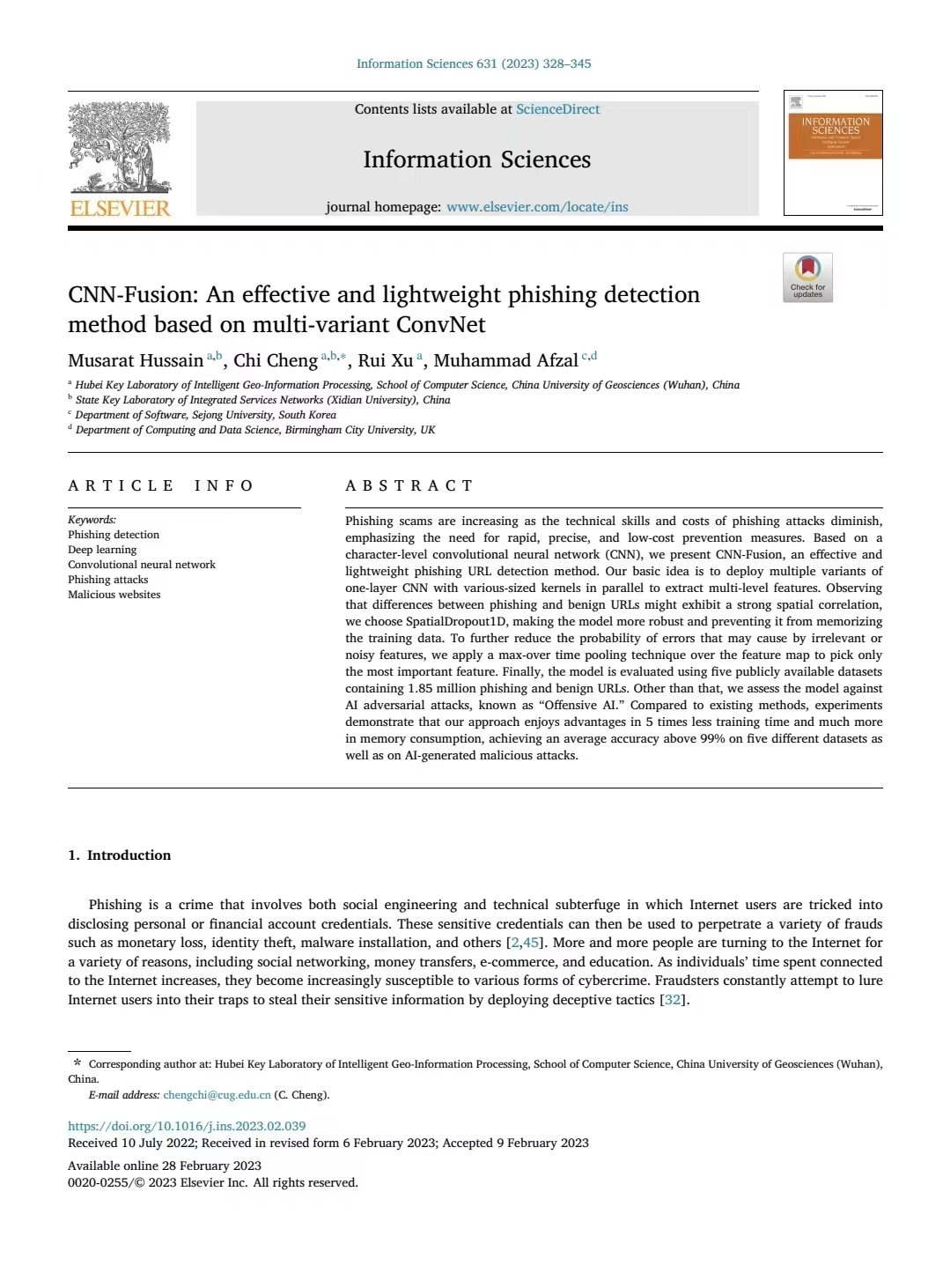 近日,免费看a片 免费看a片 程池老师团队与英国伯明翰城市大学计算Muhammad Afzal教授在国际知名期刊《Information Sciences》(T1, IF=8.233)上共同发表学术论文《CNN-Fusion: "CNN-Fusion: An Effective and Lightweight Phishing Detection Method Based on Multi-Variant ConvNet"》。论文的第一作者Musarat Hussain(中文名:胡文硕)是免费看a片 2020级巴基斯坦籍硕士研究生,通讯作者是程池老师。